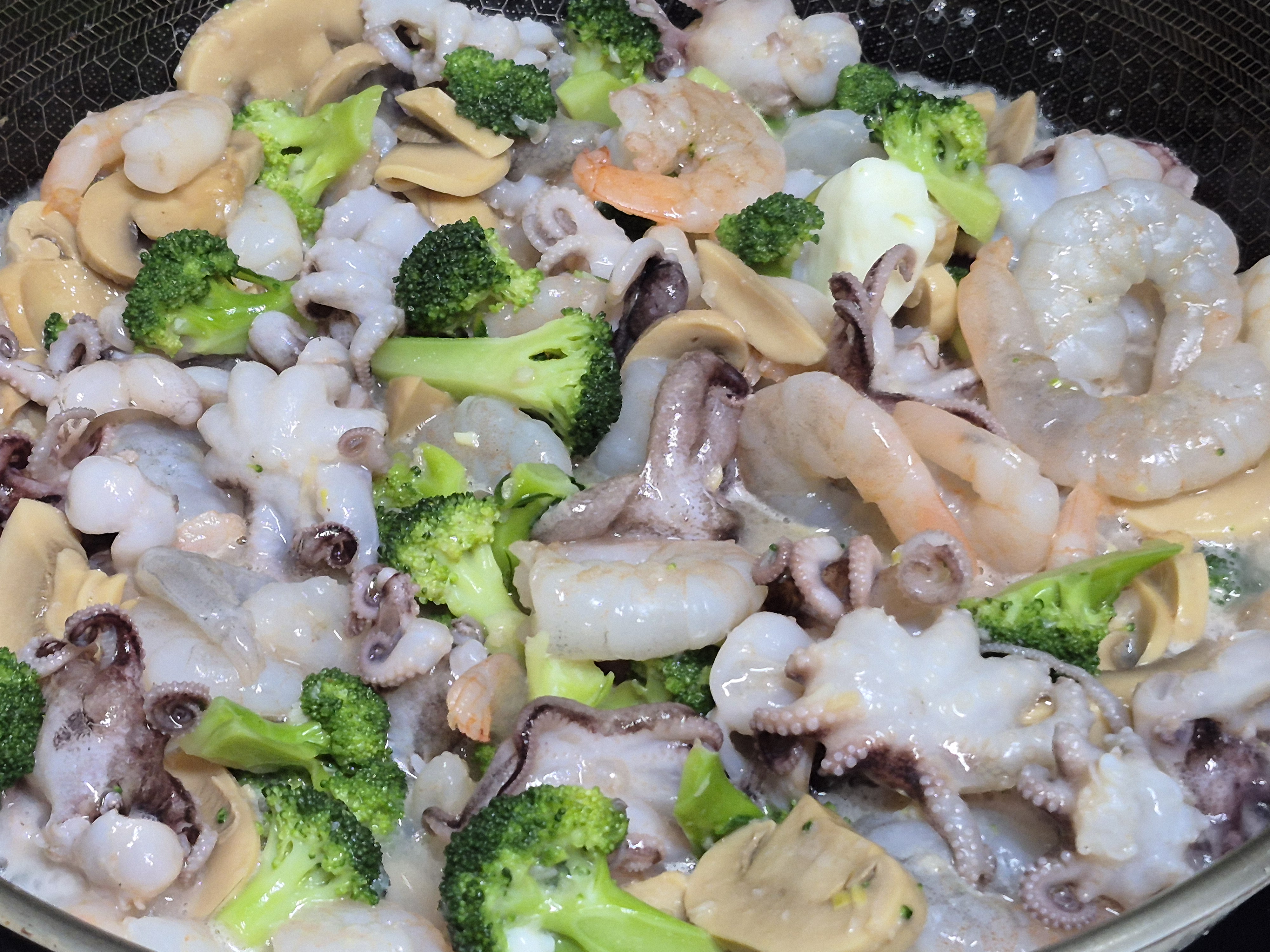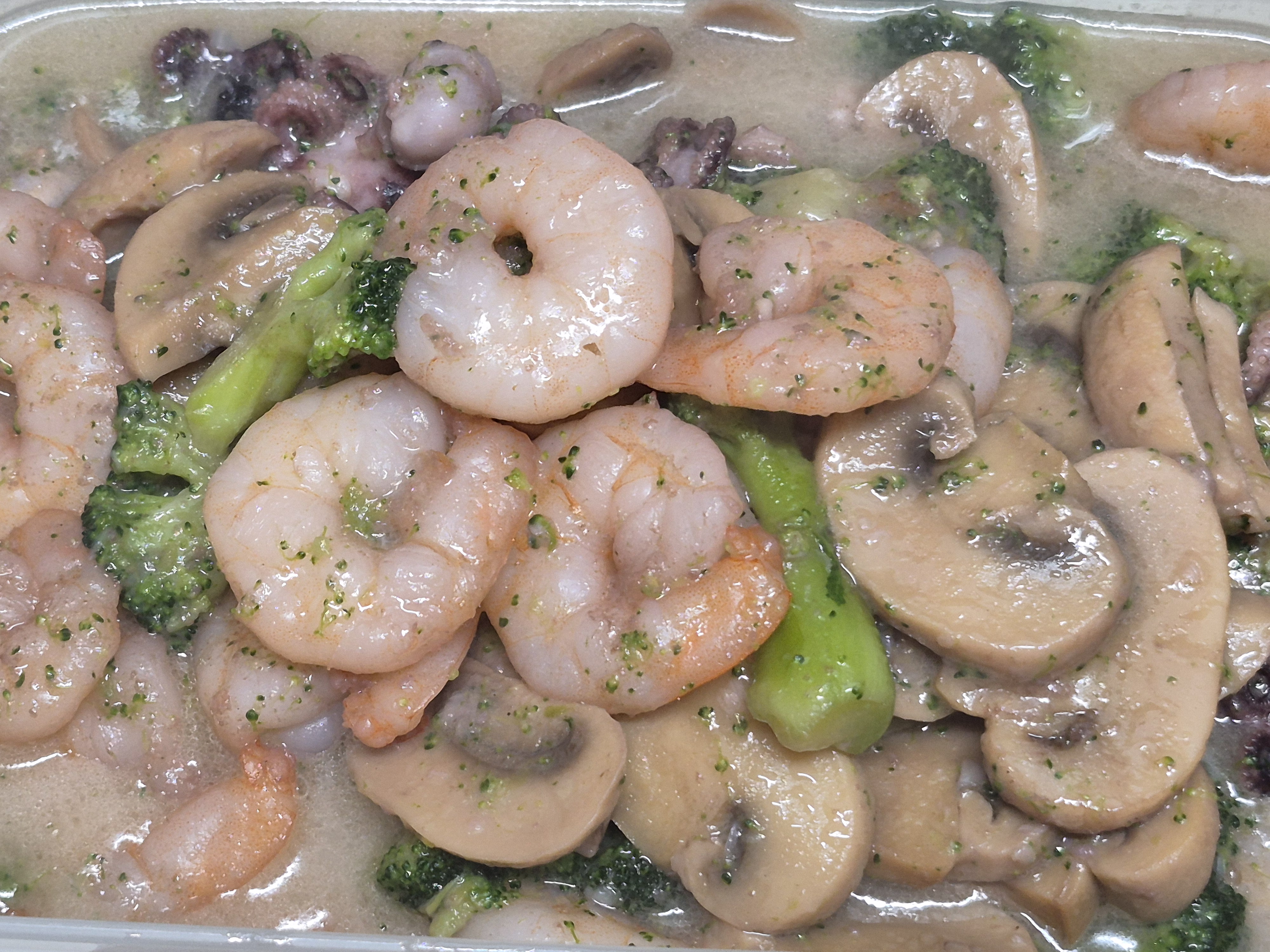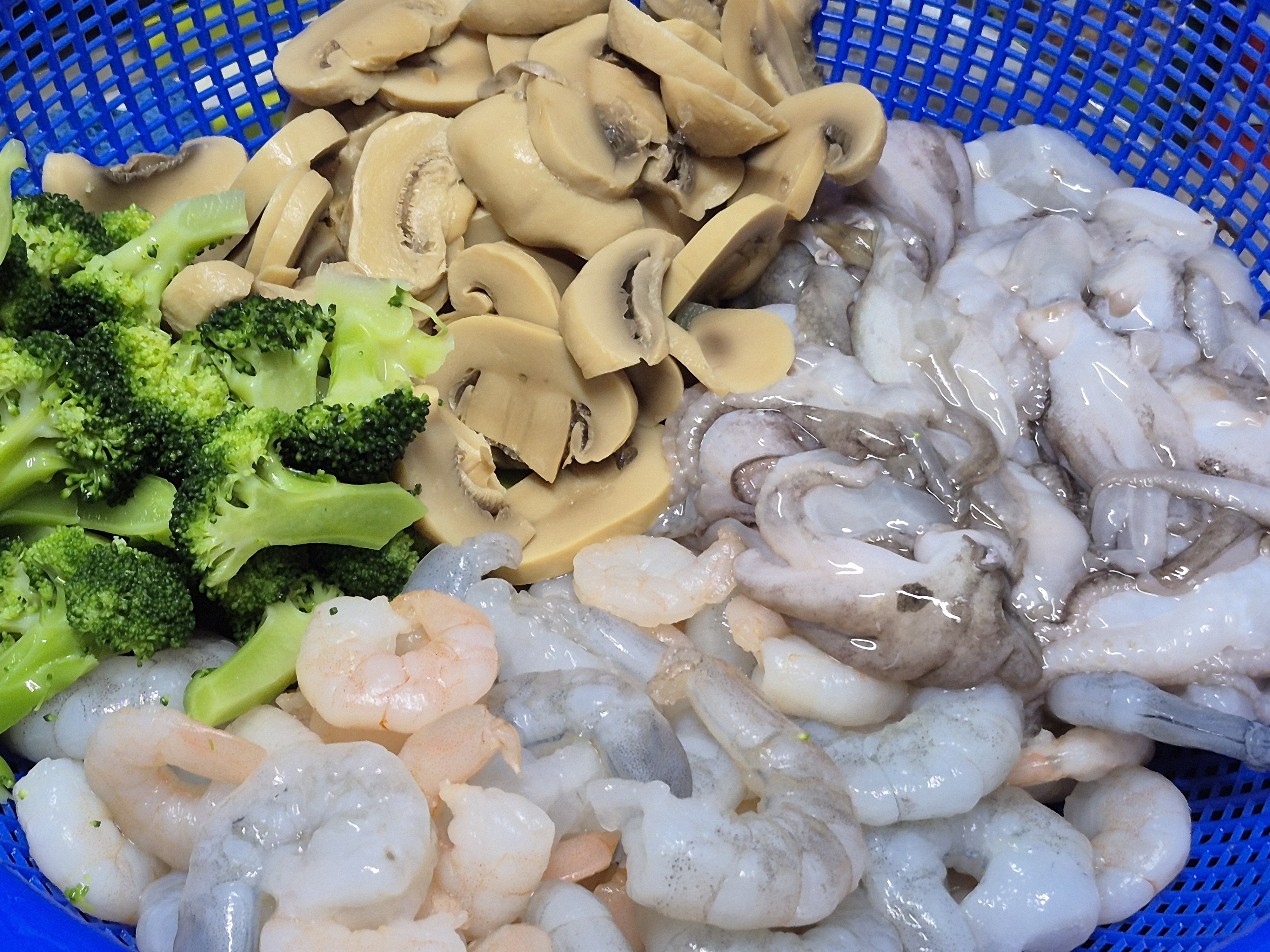 재료들. 쭈꾸미 새우 양송이 통조림 브로콜리 살짝 삶아 썰어. 씻어 준비해 줍니다