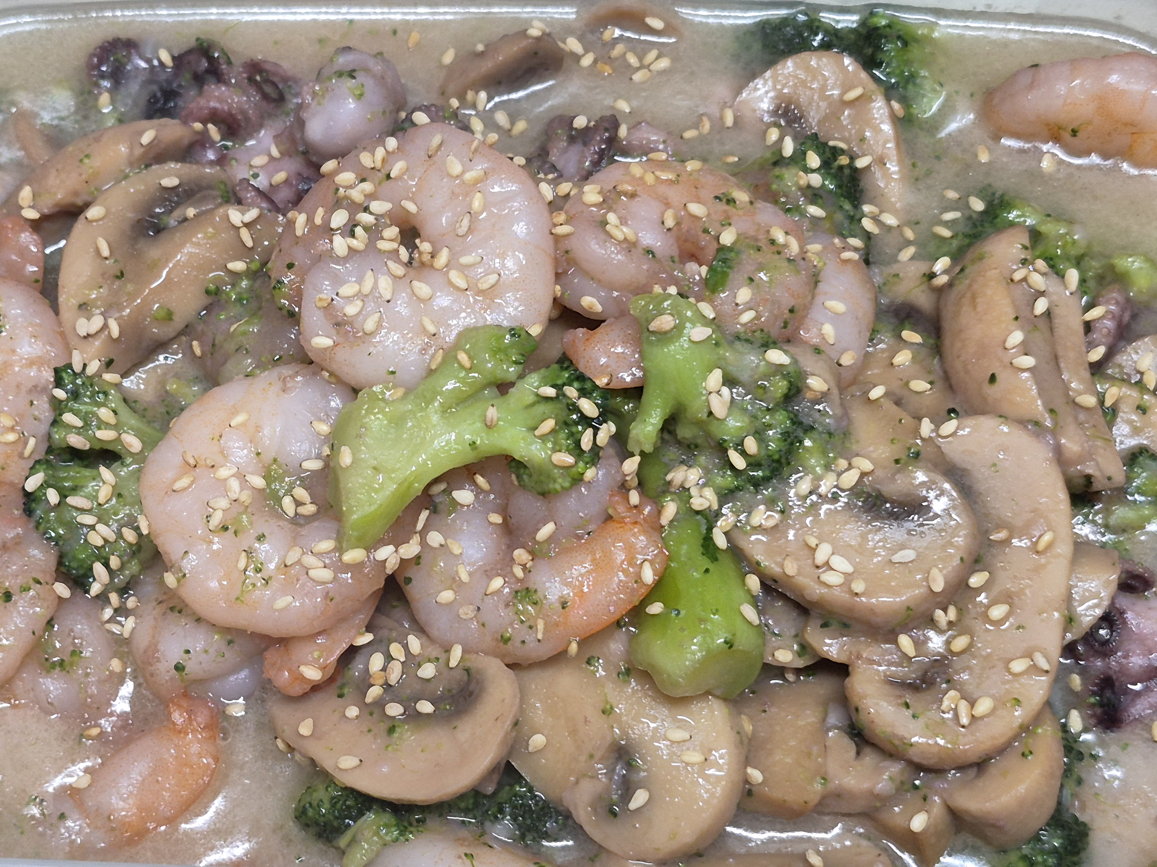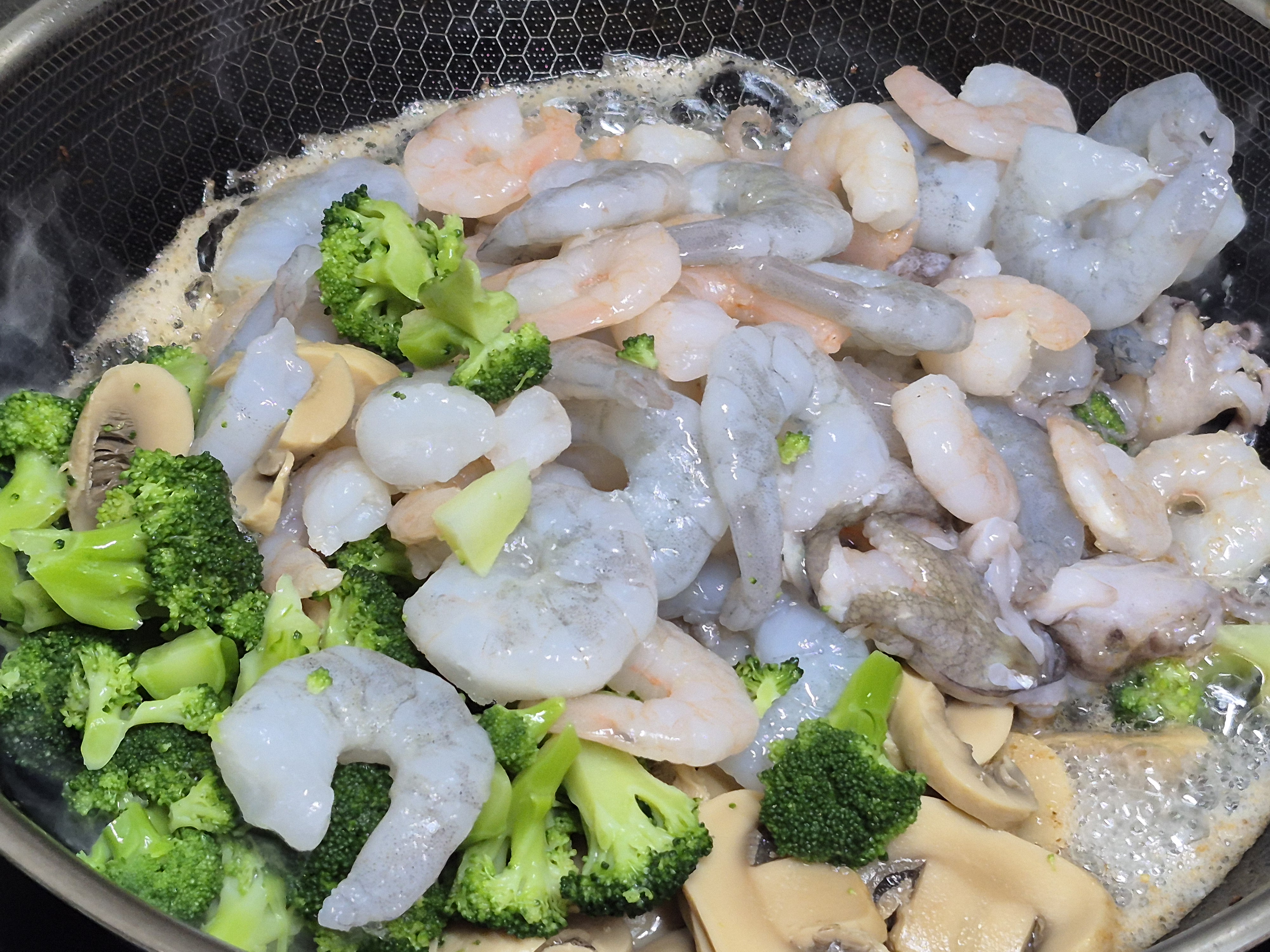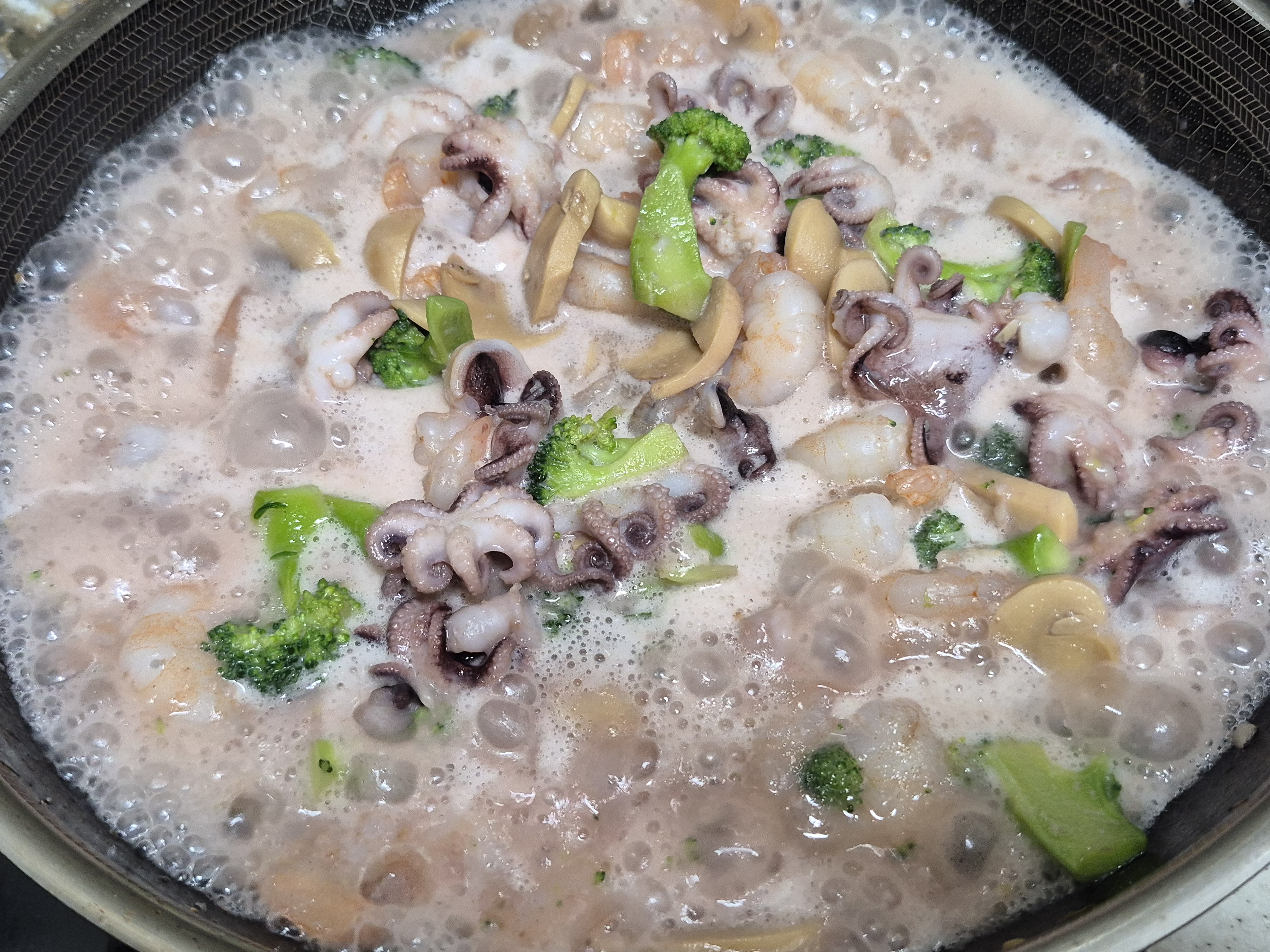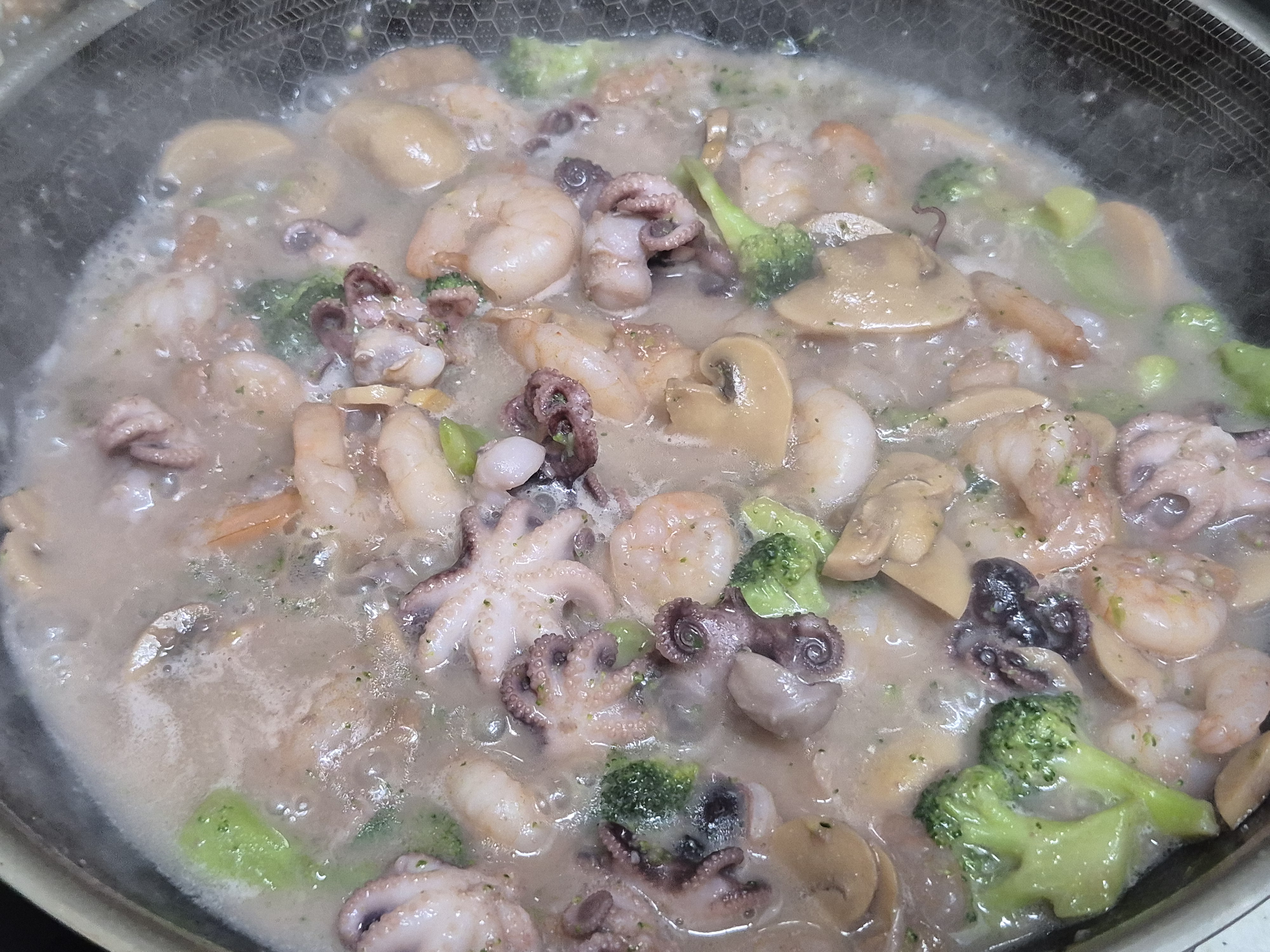 재료들. 쭈꾸미 새우 양송이 통조림 브로콜리 살짝 삶아 썰어. 씻어 준비해 줍니다