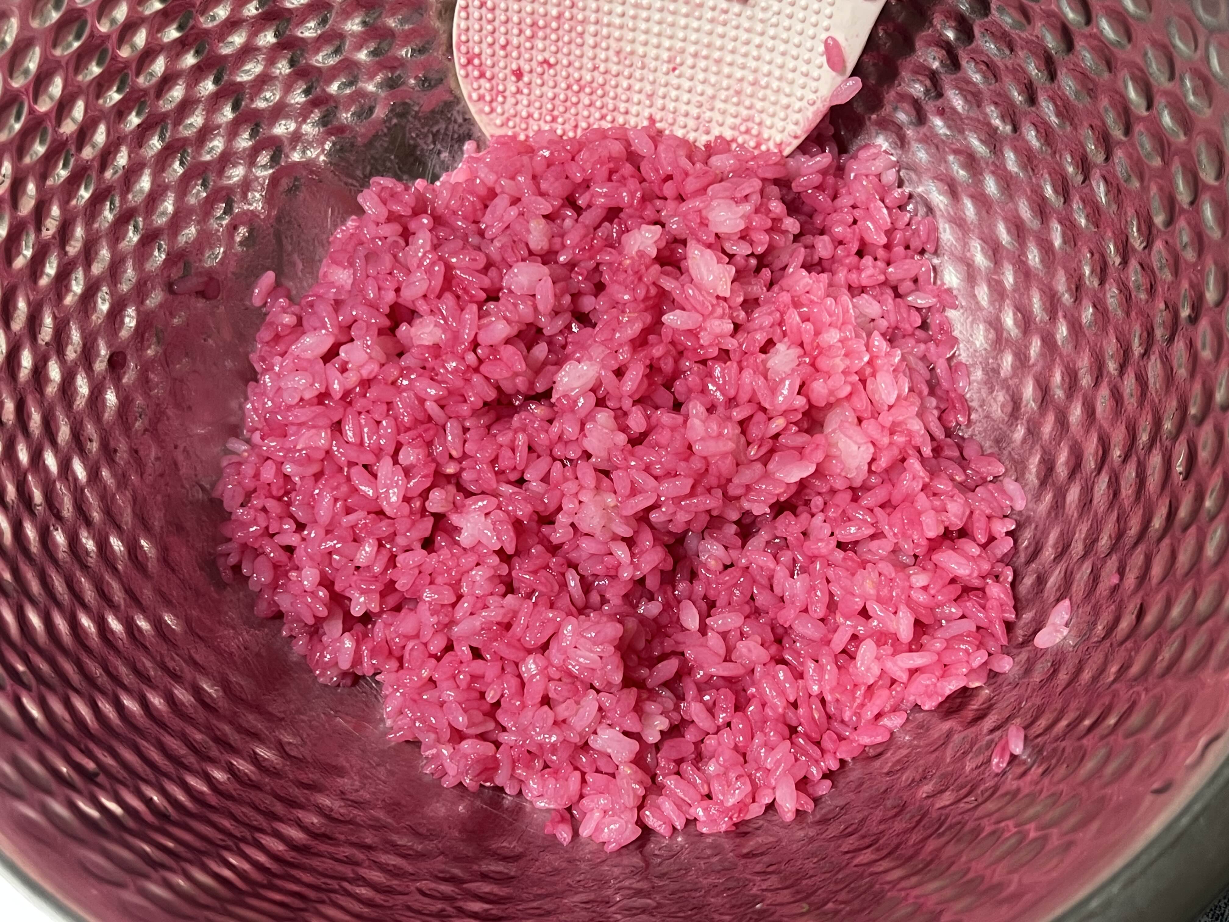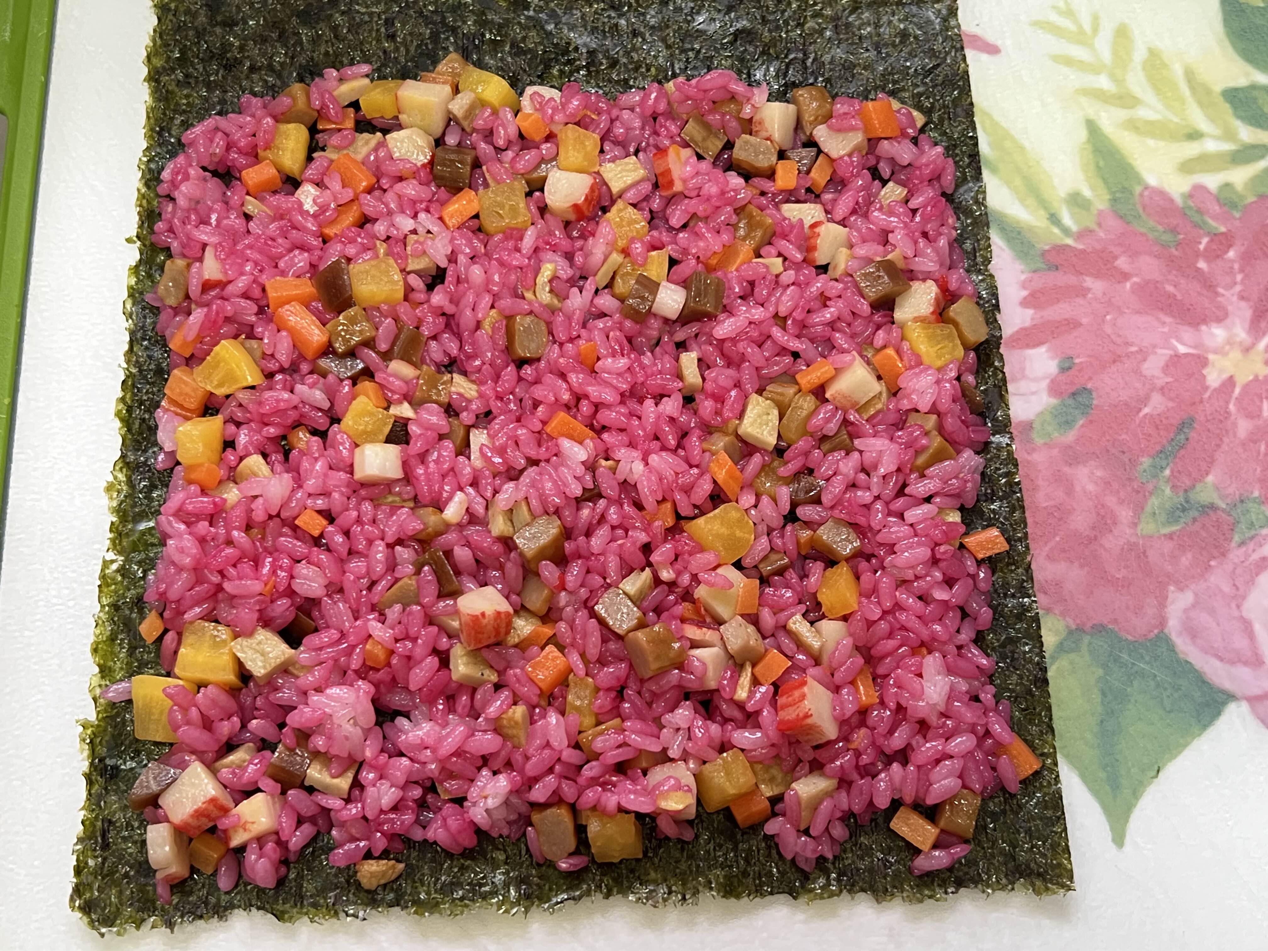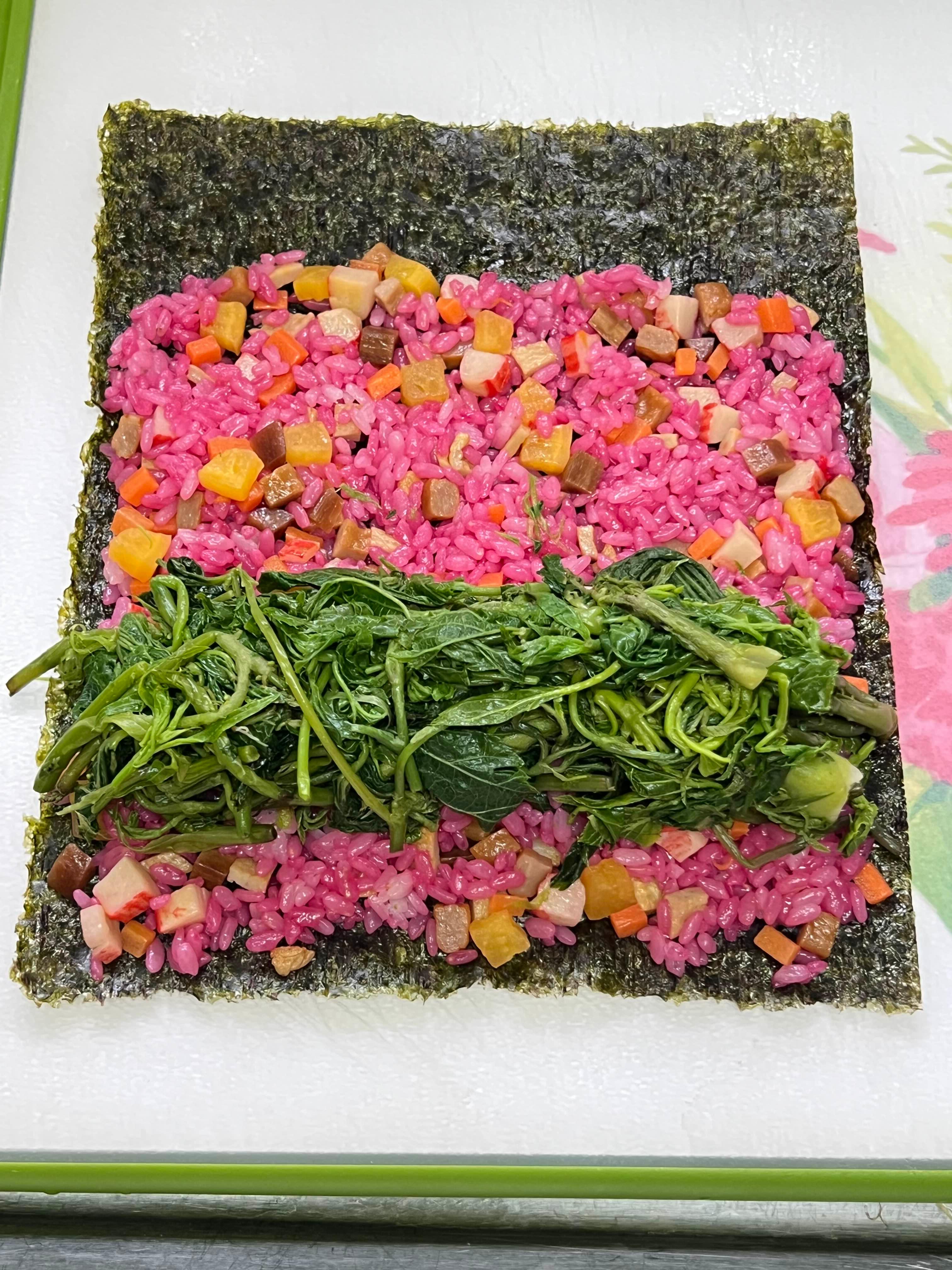 밥에 분홍요리초. 참기름. 구운소금넣고 섞은다음