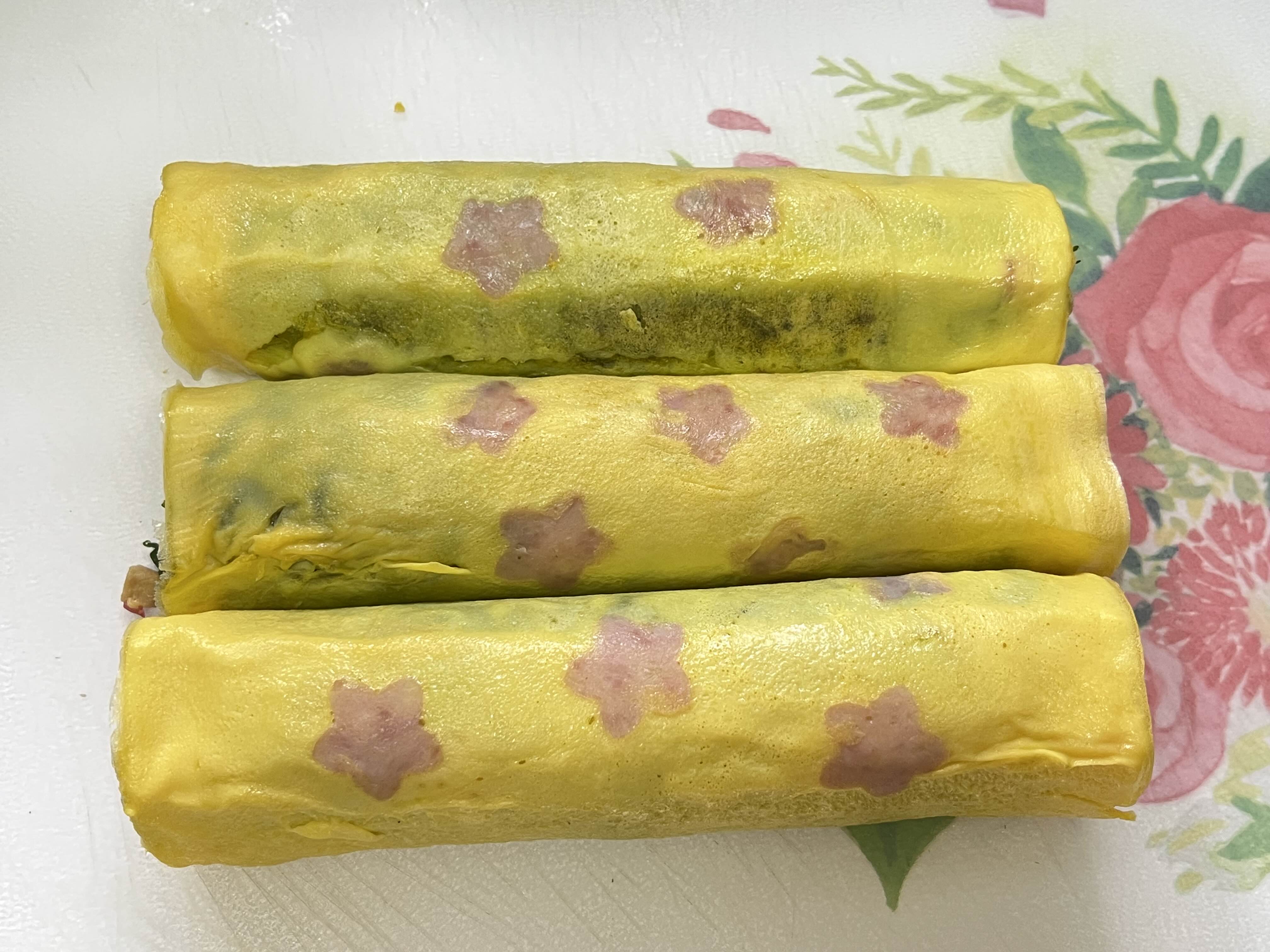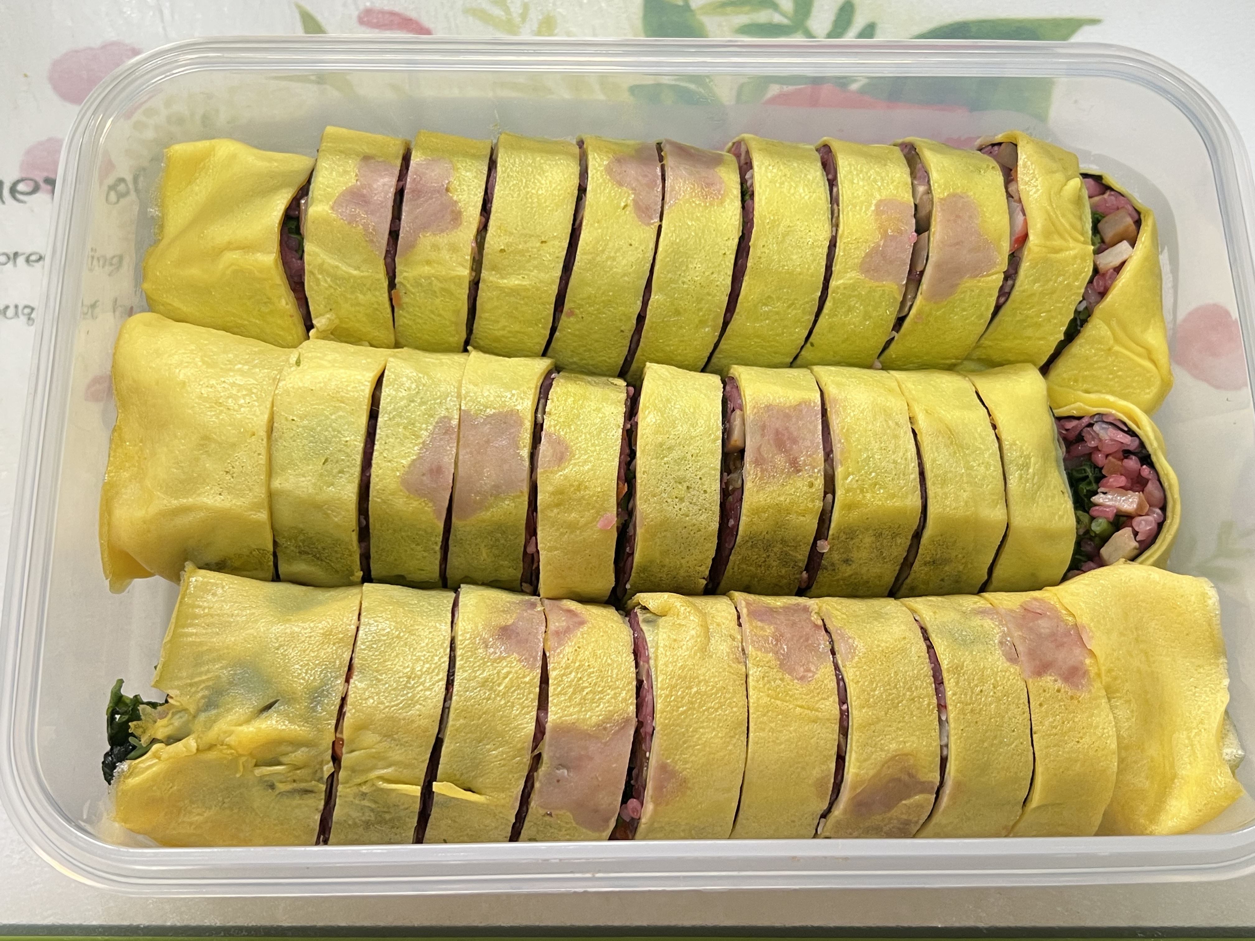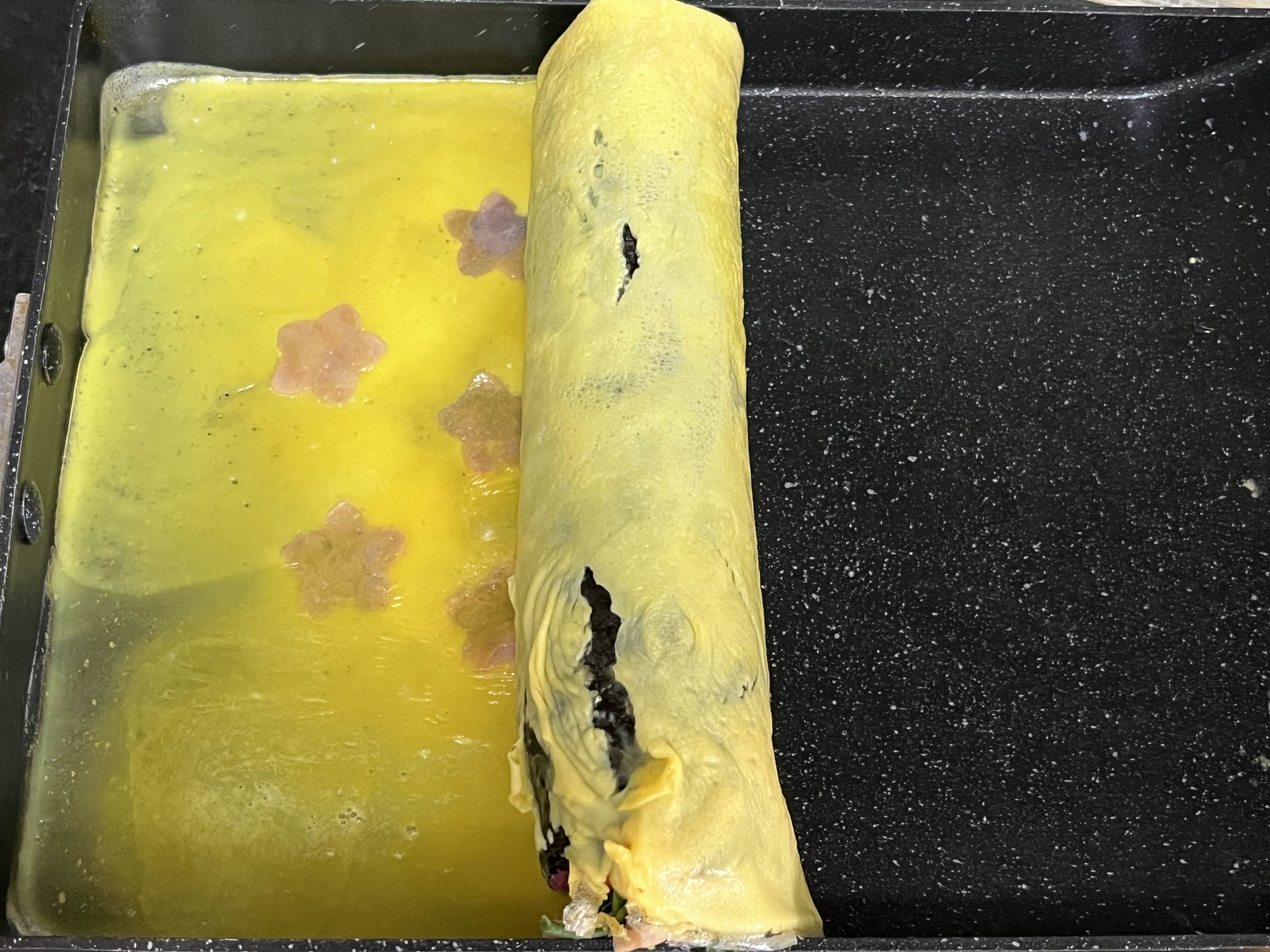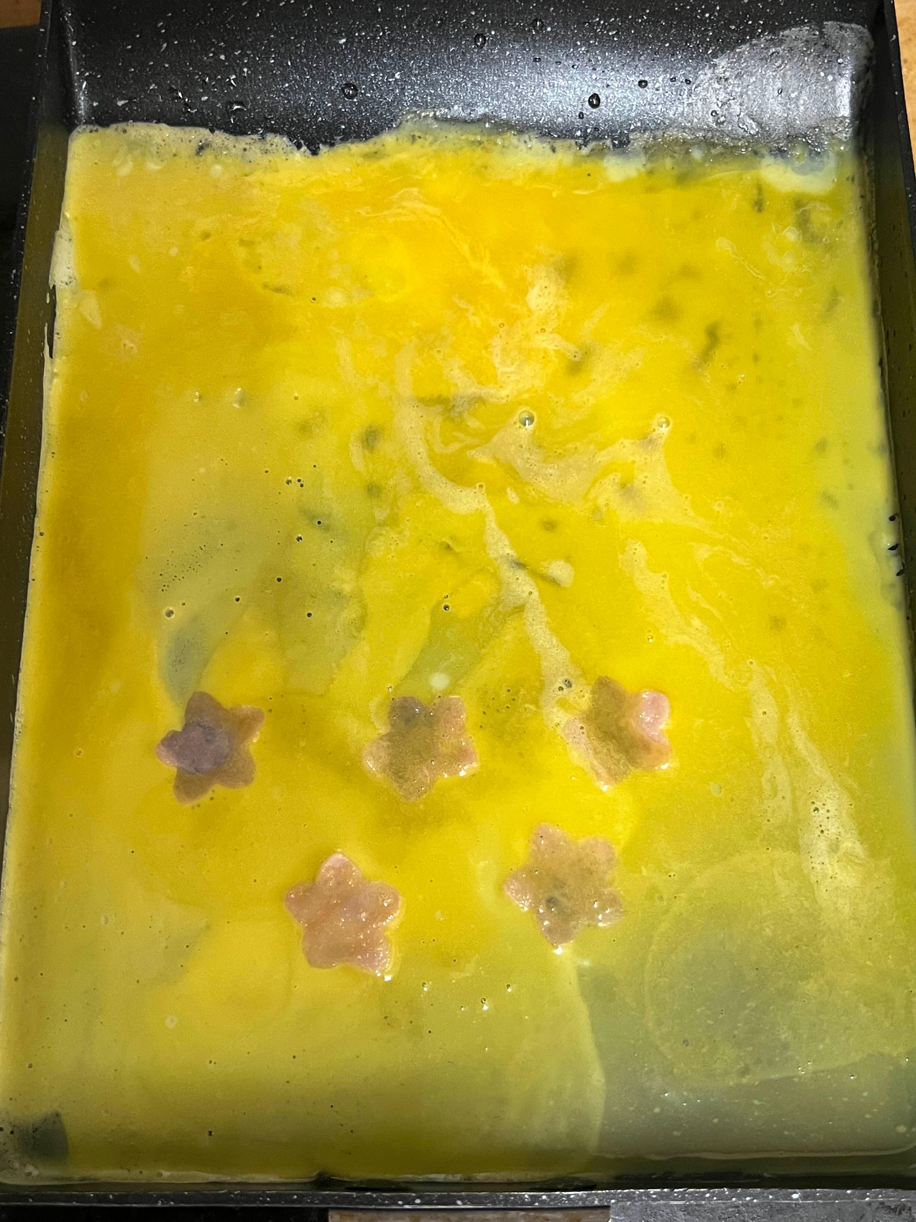 계란물 풀어서 후라이팬에 햄 올리고 계란물붓고