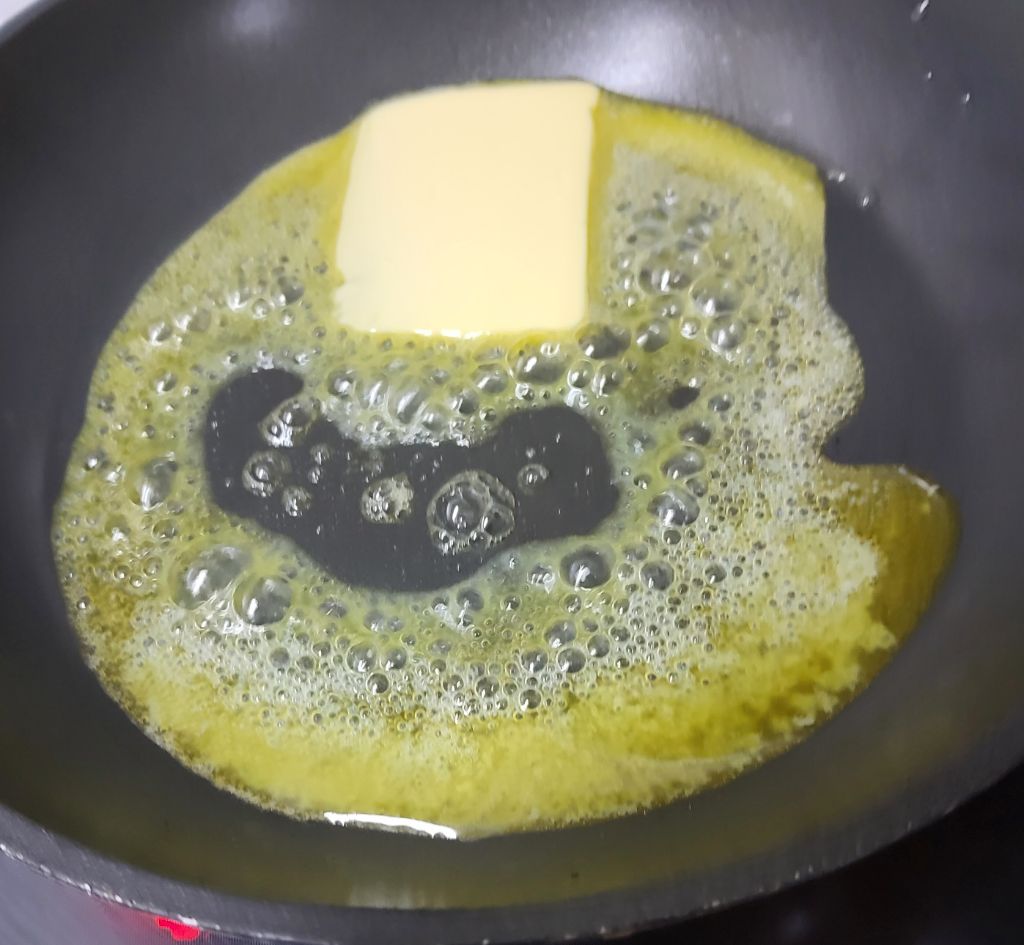 버터 한조각을 달궈진팬에 올리고 녹여줍니다