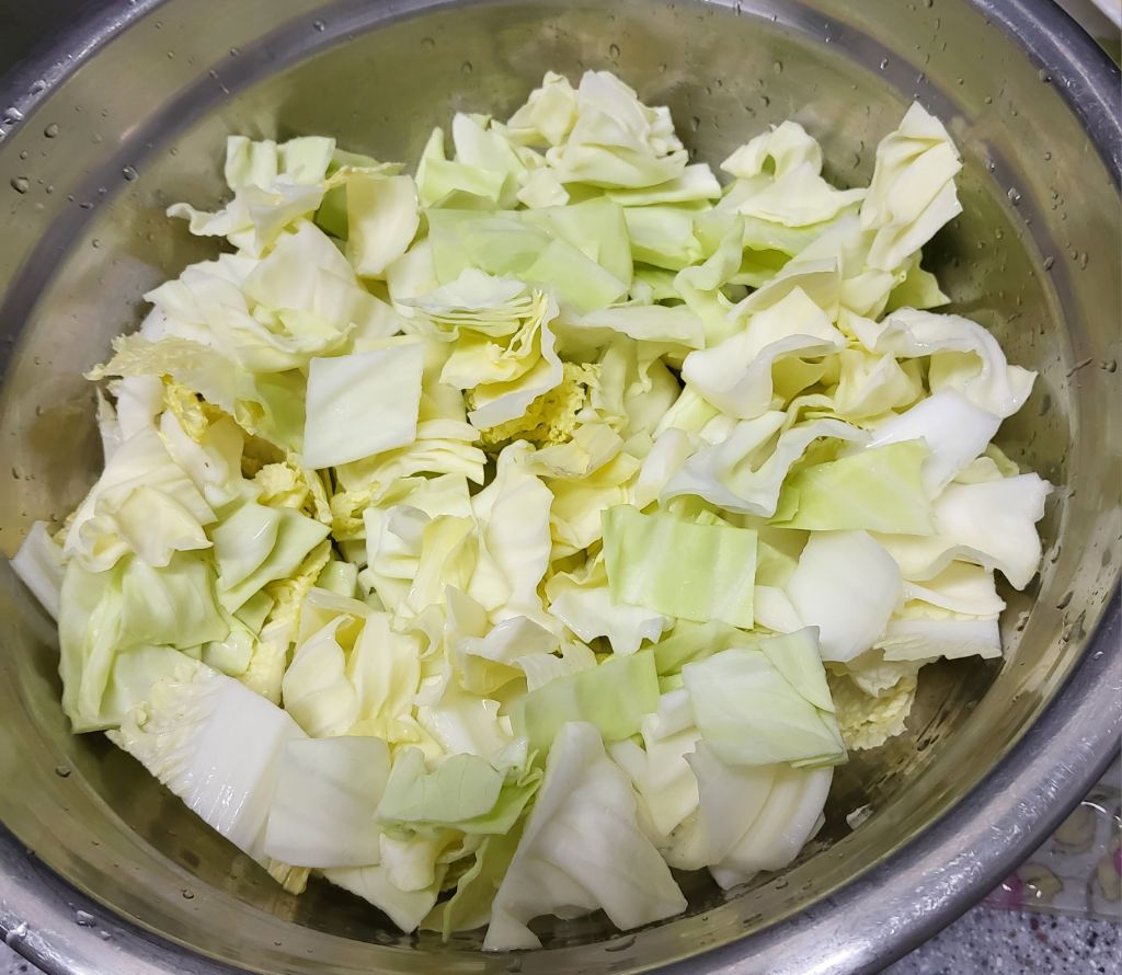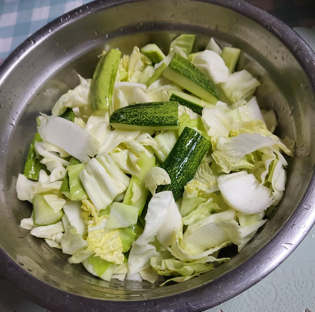 양배추와 오이는 한번 씻어주고 물기 빠진 다음에 썰어놓은 모든야채 넣어주고
