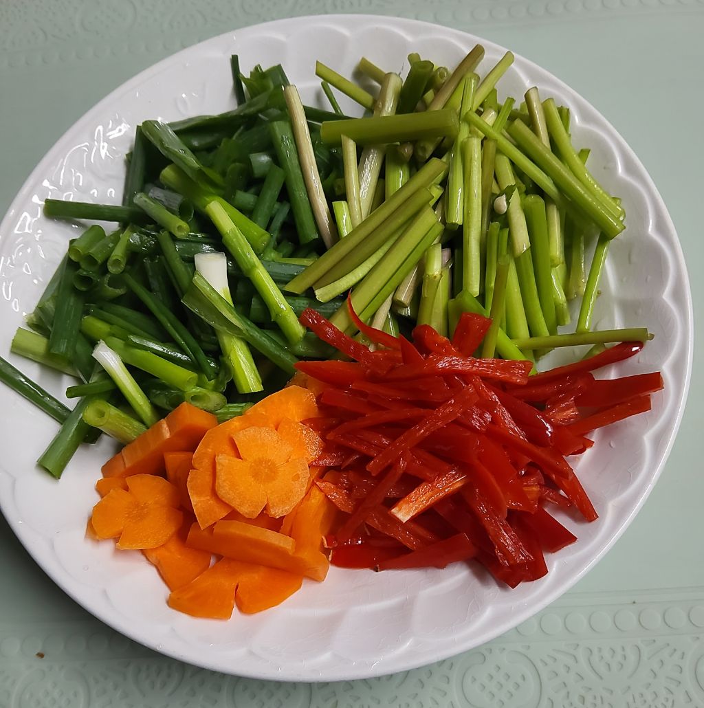 실파 ,미나리, 홍고추 길쭉하게 썰어주고 당근 꽃모양으로 썰어줍니다