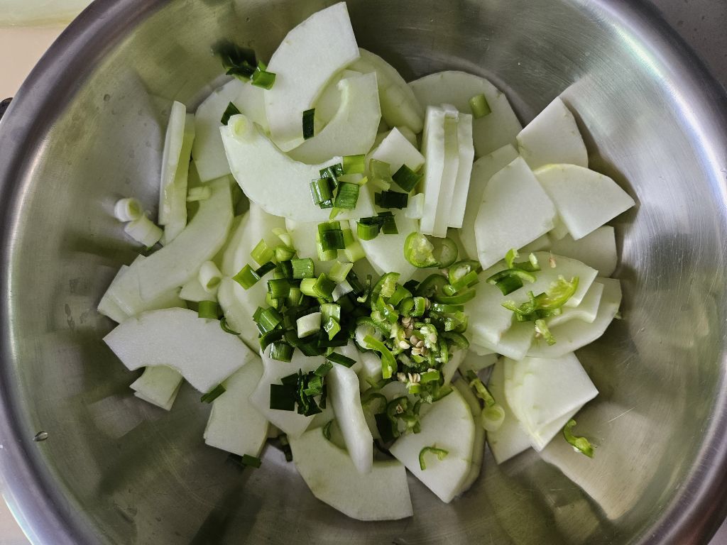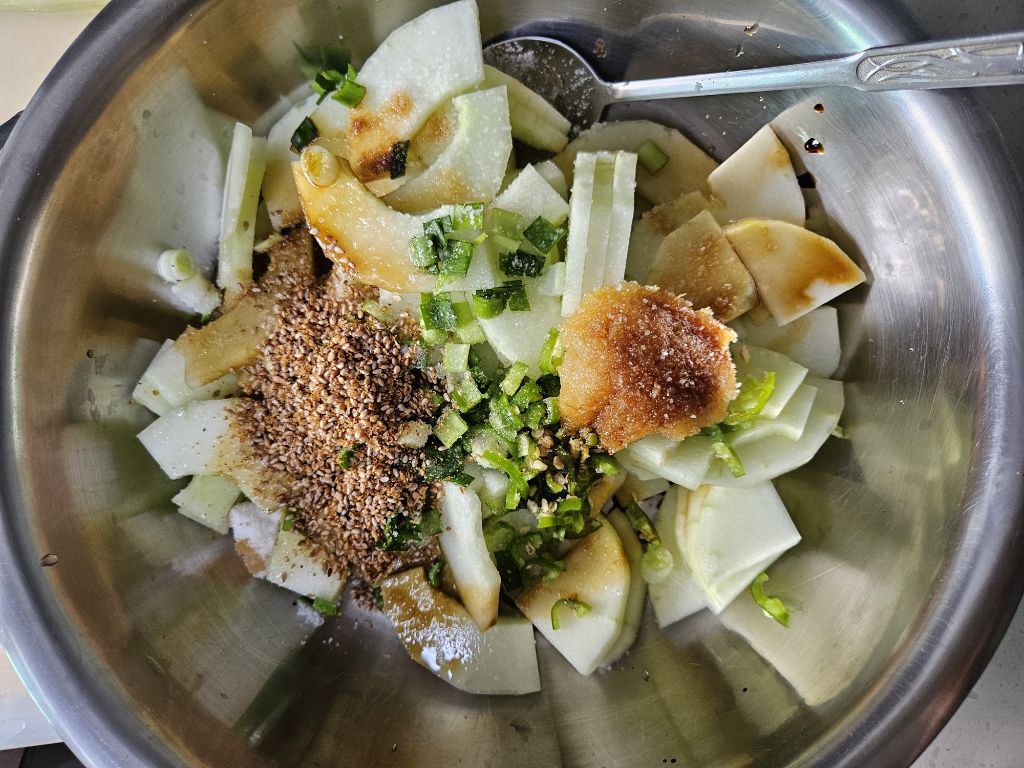노각에서 수분도 빠져서 국물이 생겨요.