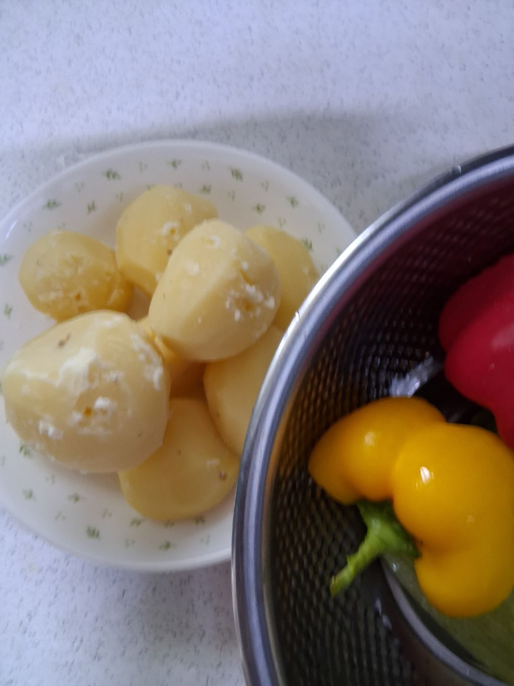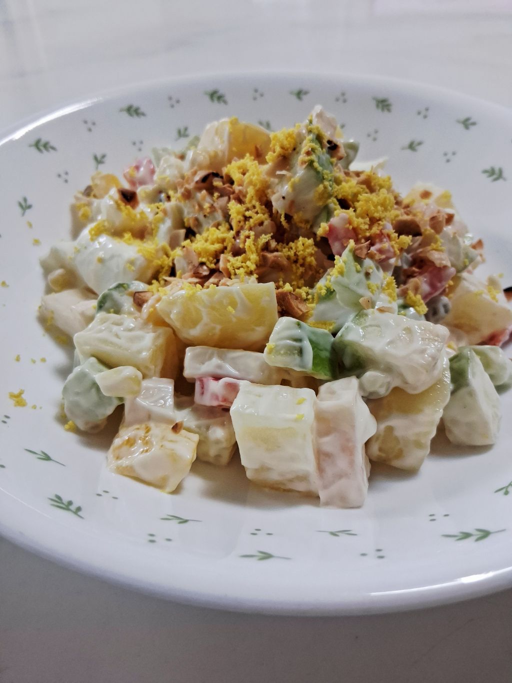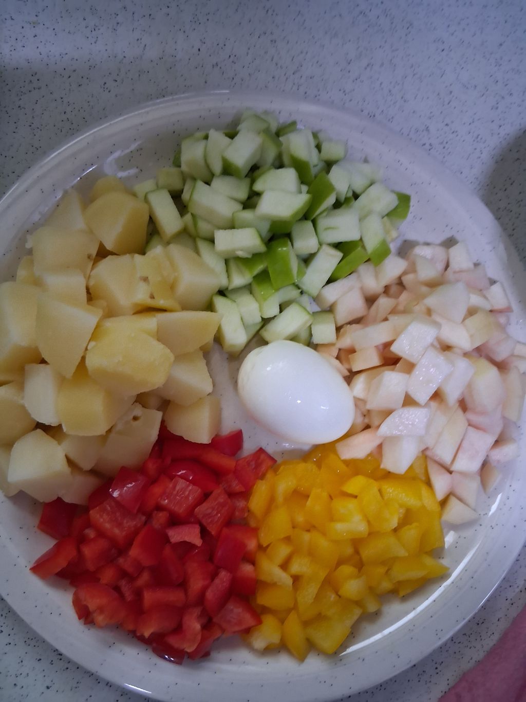 ♡재료;감자 옥수수 사과 복숭아 오이 땅콩 홍파프라 노란파프리카 계란 마요네즈...