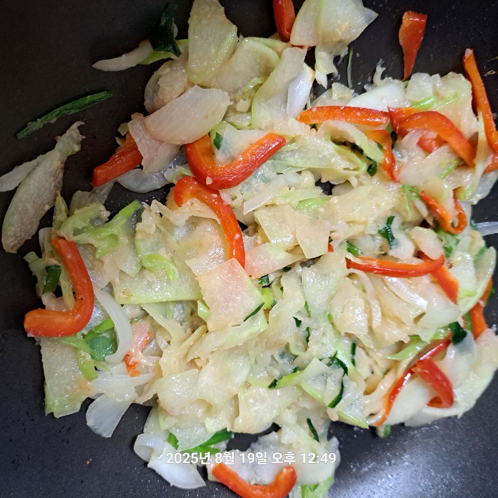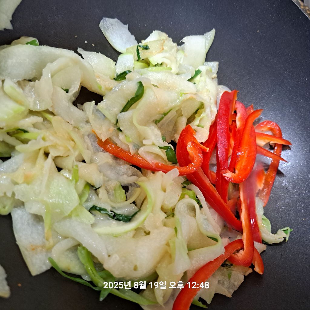휘리릭 섞어주며 파프리카 놓어요. 알싸한 맛 고추를 넣으면 더 맛있을낀데.