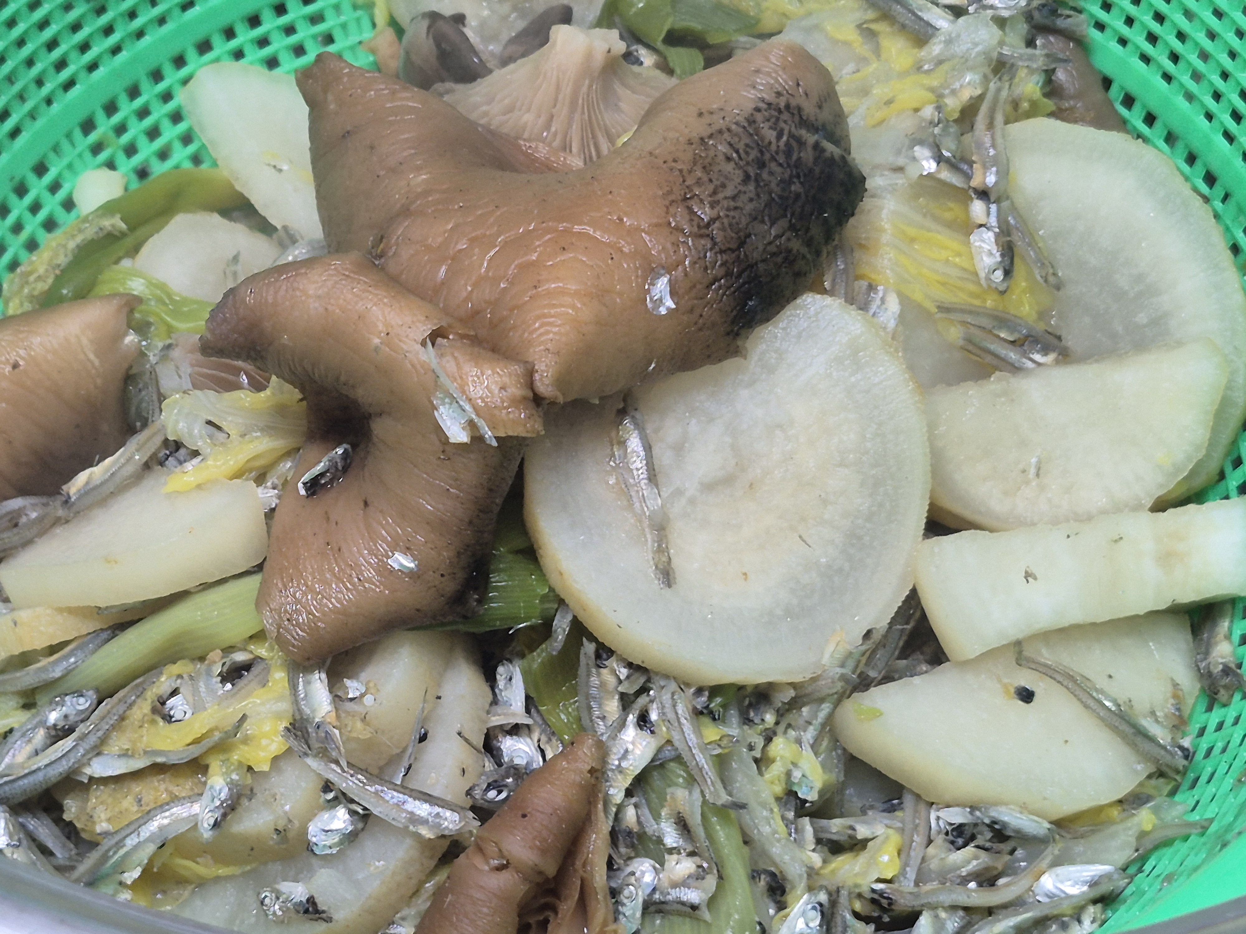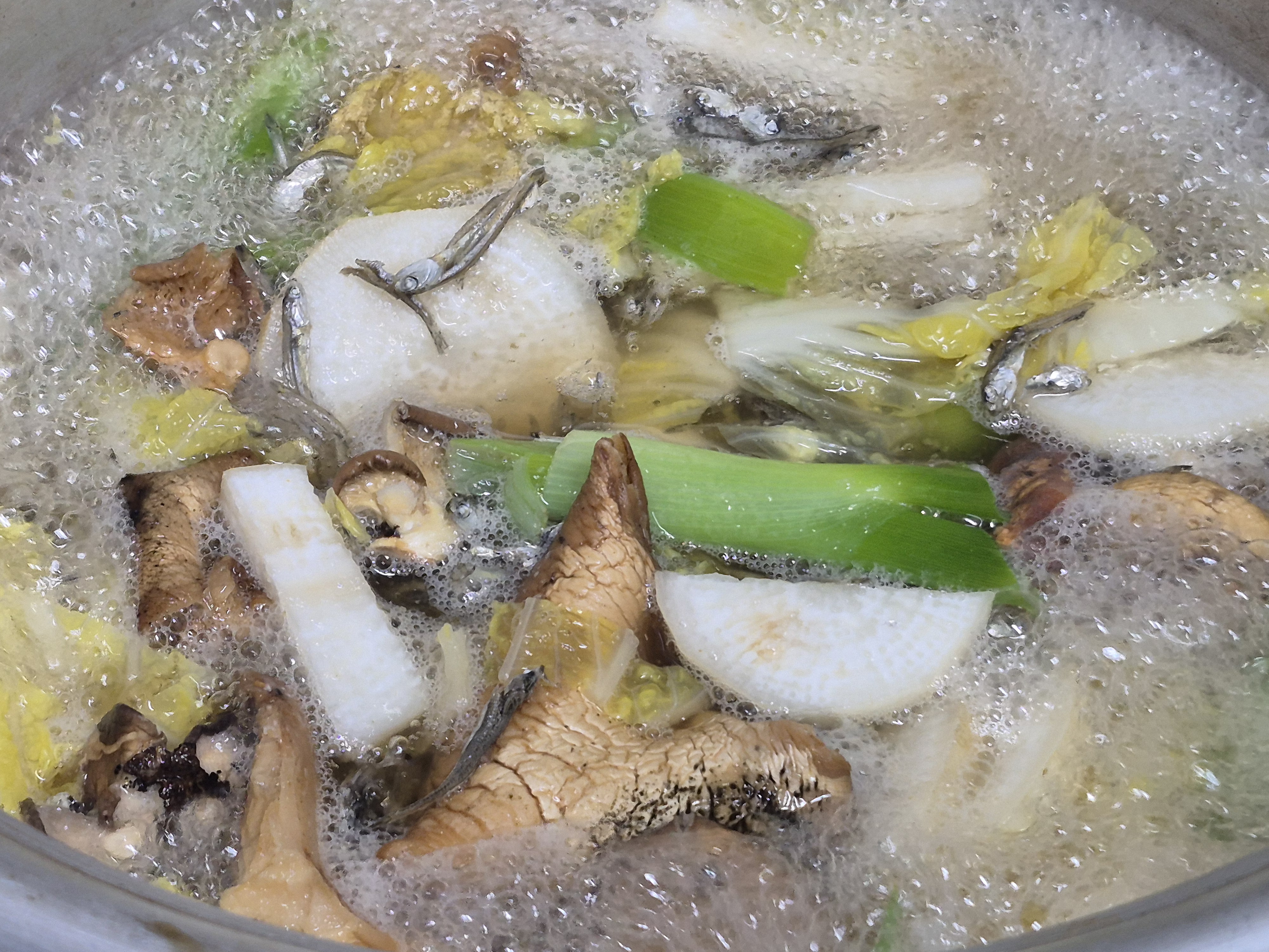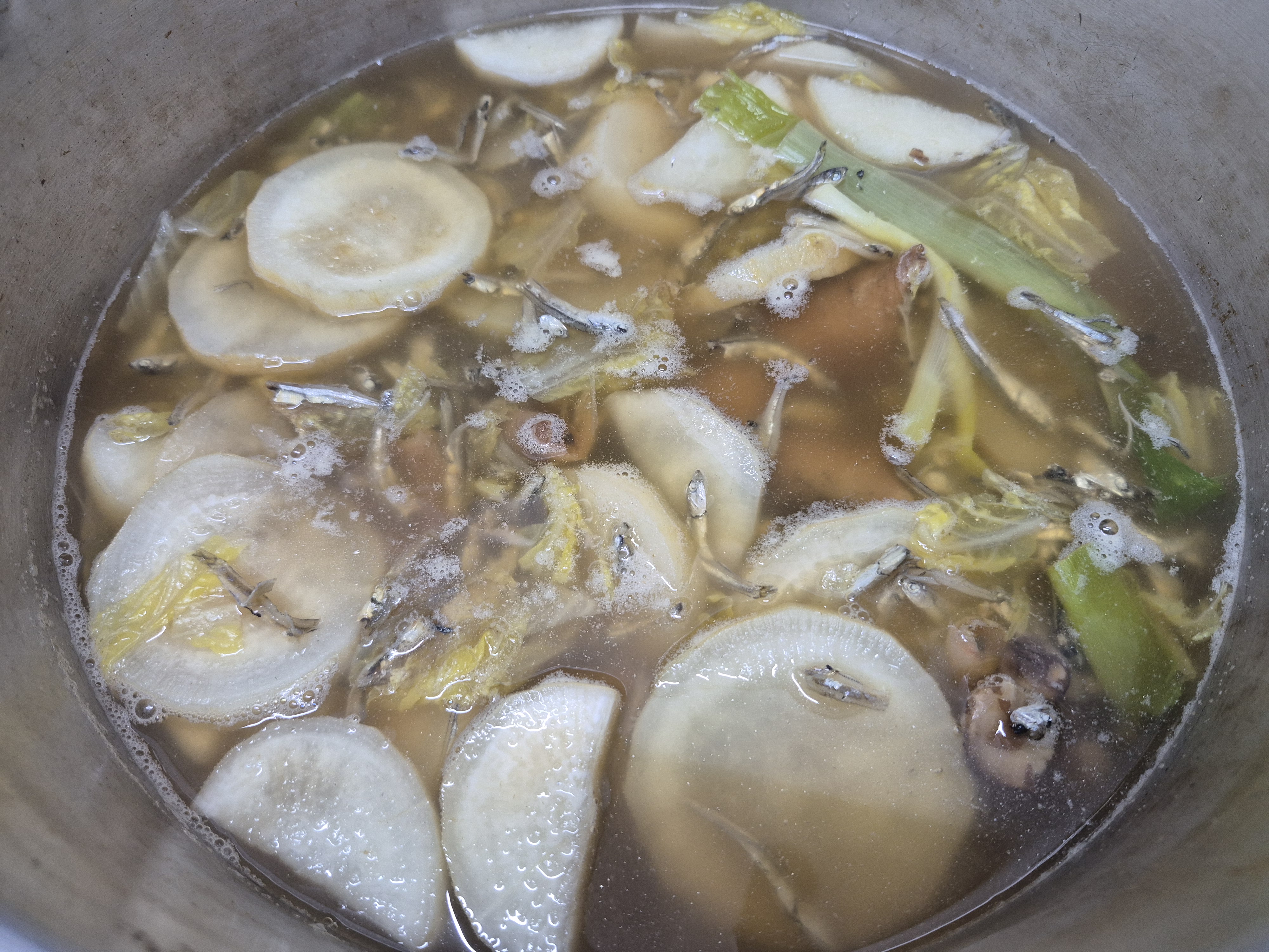 대파 배추 무우 자연산 느타리버섯 잔잔한 멸치넣고 육수를 끓여줍니다