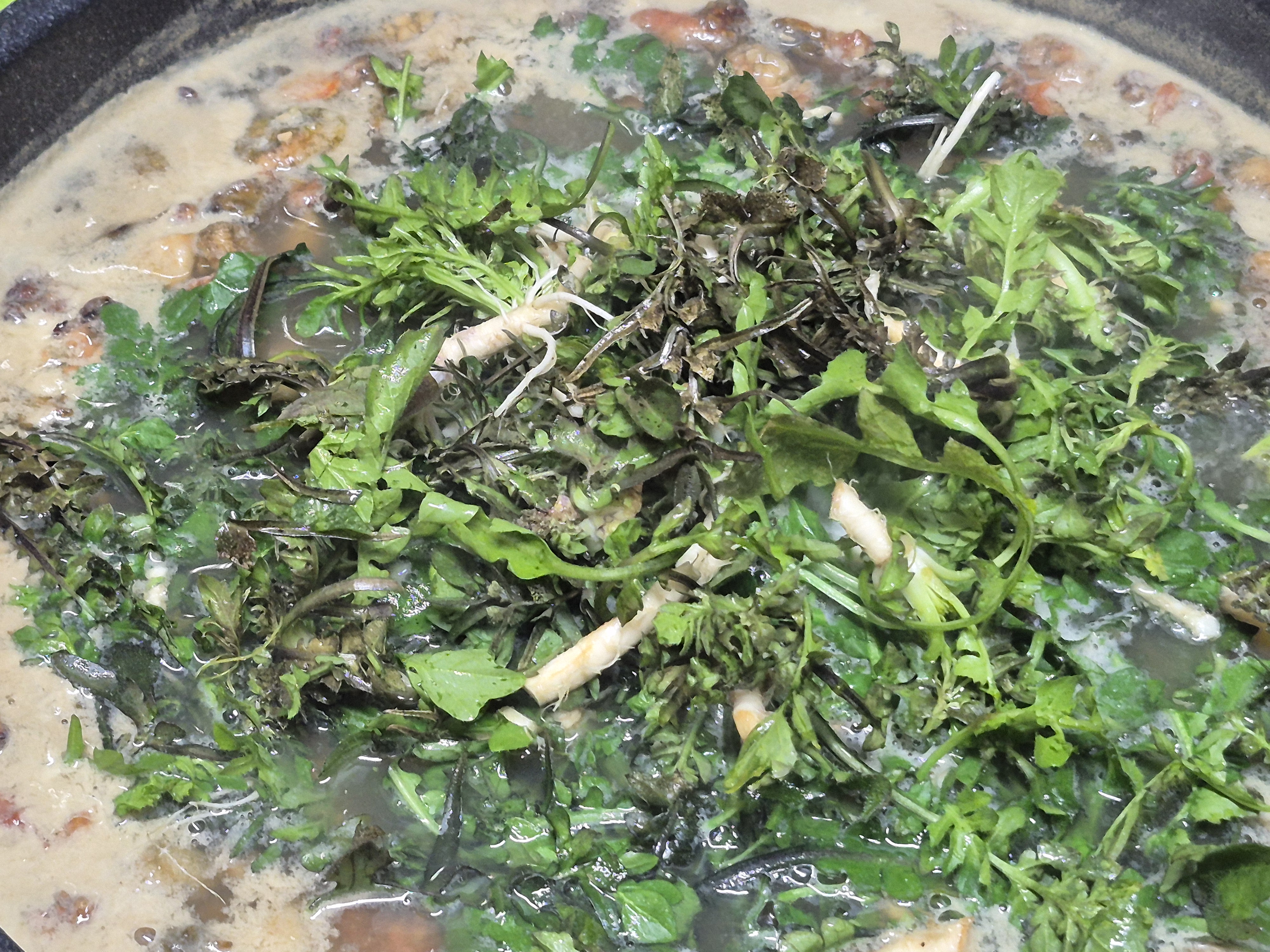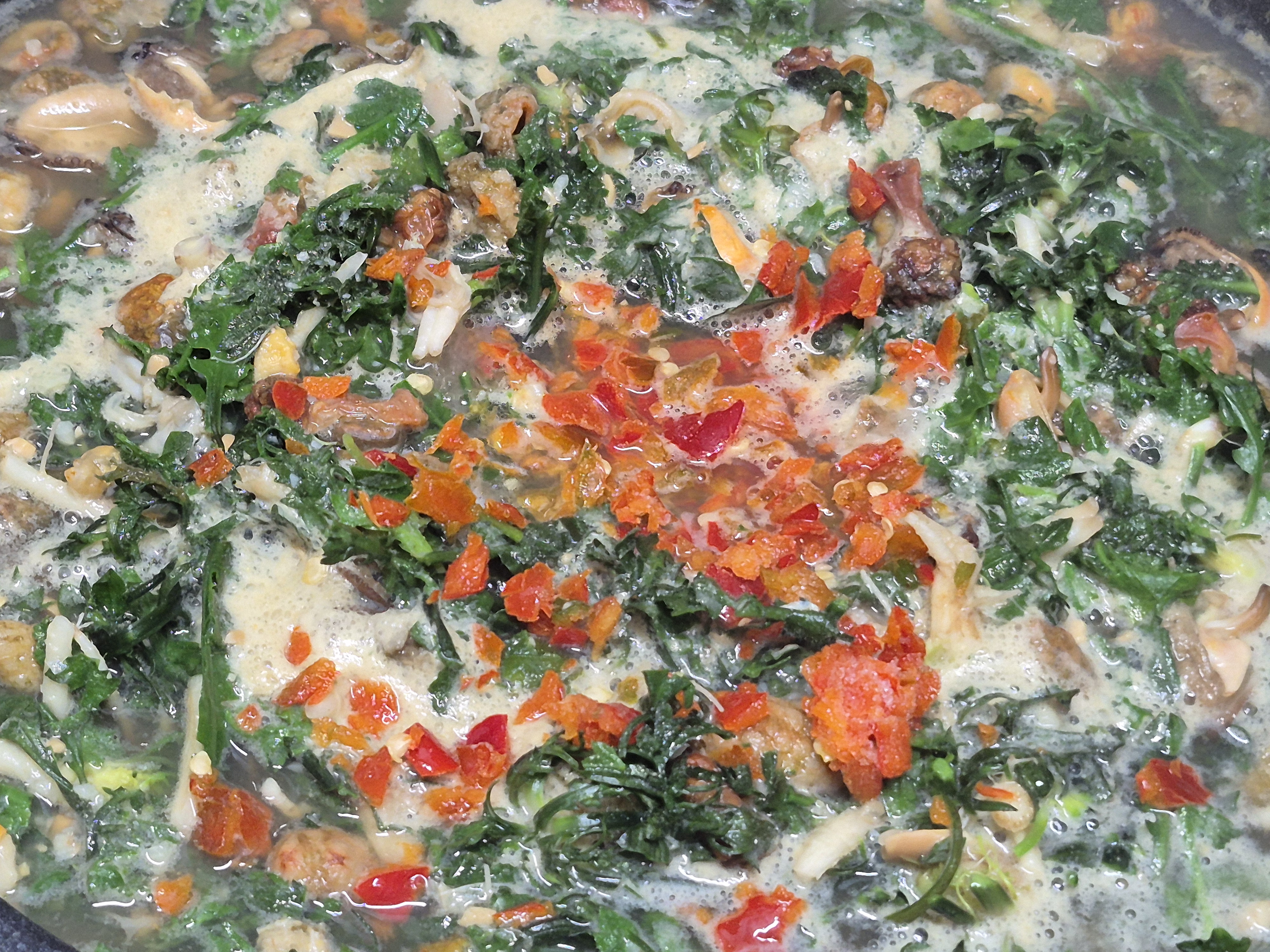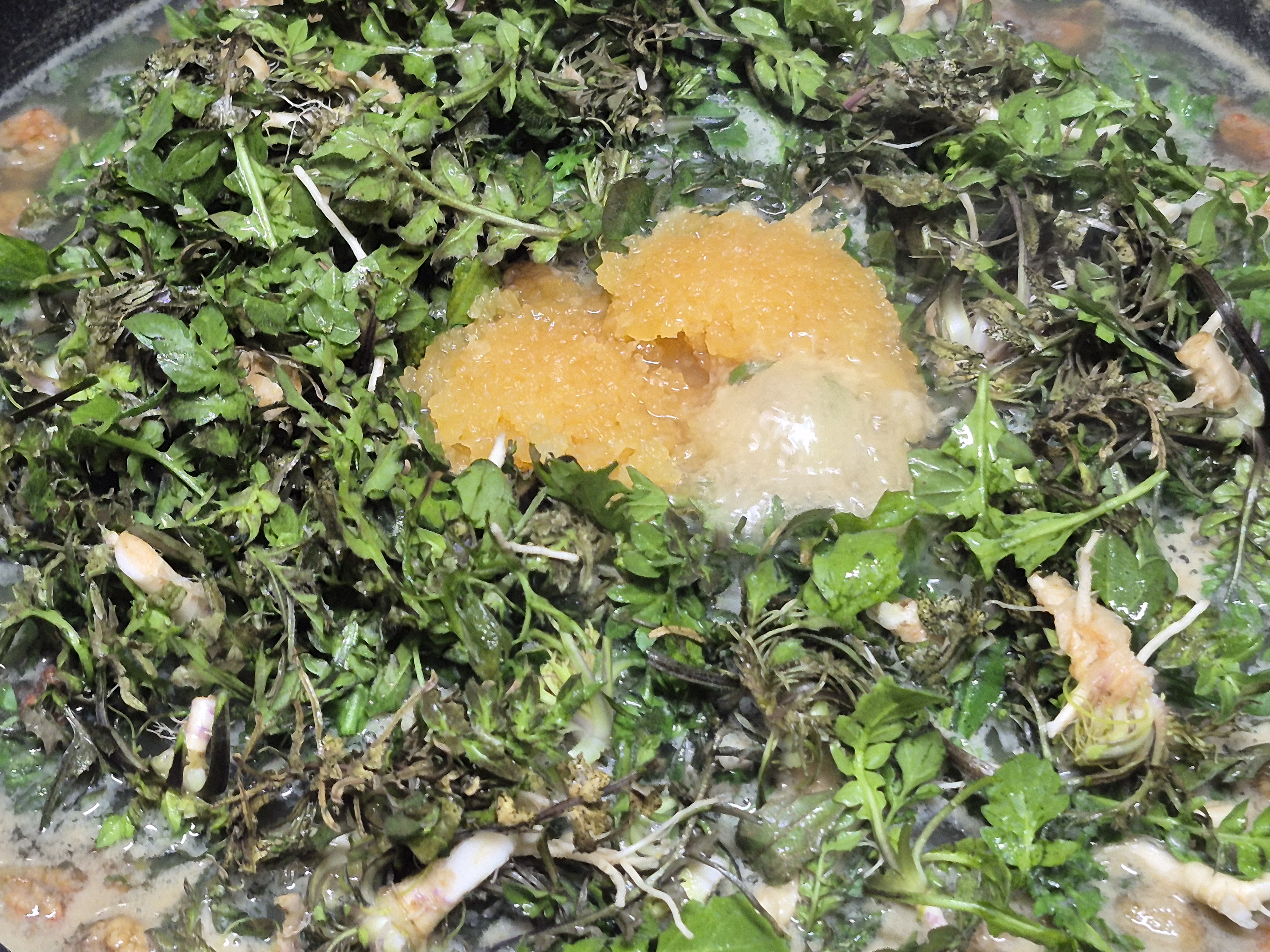 냉이향이 너무 찐하네요 해물향도 가득이고 너무너무 맛있는 냉이 된장국 입니다