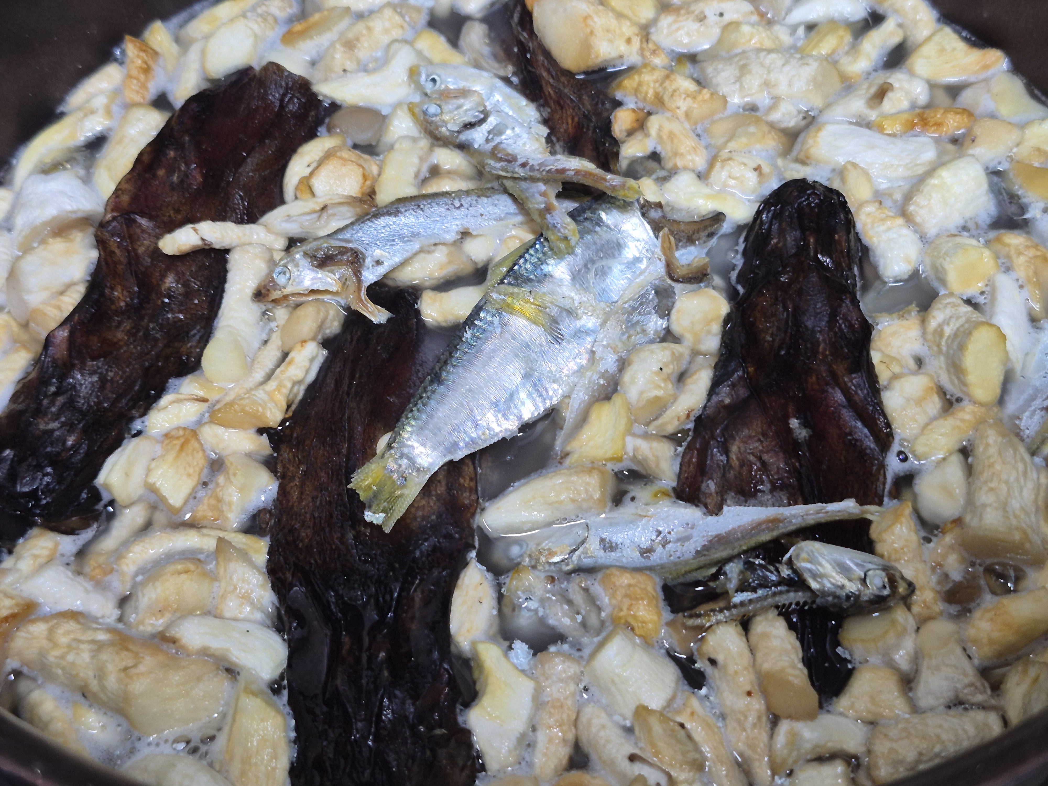 느타리버섯 기둥 말린거 동태 대가리 말린거 다시멸치 넣고 육수를 빼줍니다