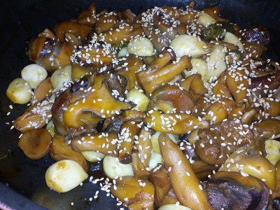 어느정도 졸인 후 통마늘을 투입하고..7분정도 후에 불끄고 통깨와효소건지로 만든 조청으로 마무리~~