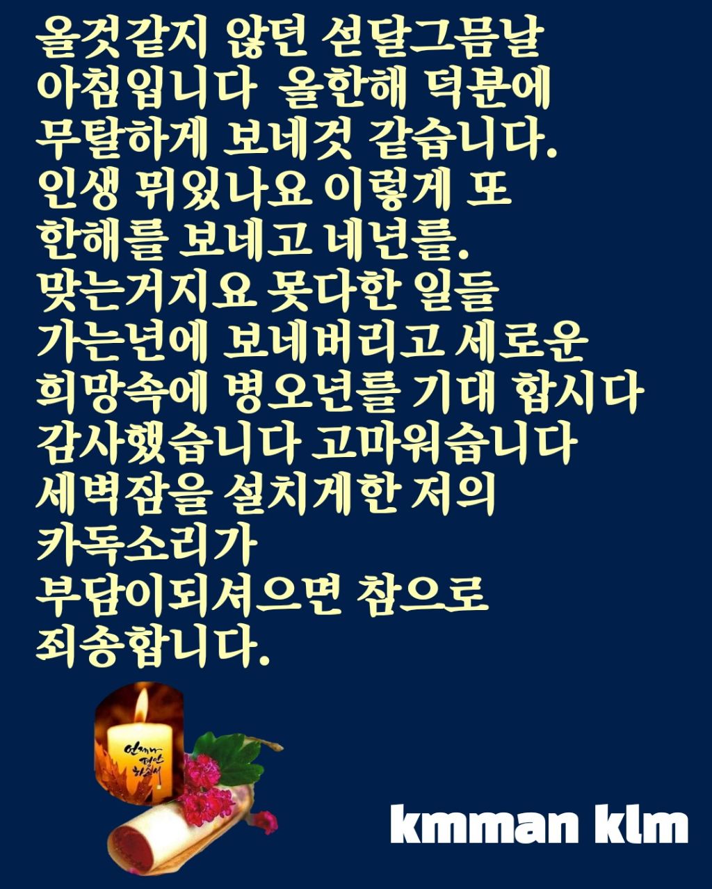 섣달그믐아침. 작성자천상선비|작성시간25.12.31|조회수80 목록 댓글 2 글자크기 작게가 글자크기 크게가 다음검색 현재 게시글 추가 기능 열기 북마크 공유하기 신고 센터로 신고 댓글 댓글 2 댓글쓰기 답글쓰기 댓글 리스트 작성자천석농원(거제) | 작성시간 25.12.31 을사년이제 마지막 날이네요올 한해도 수고 많으셨습니다오늘도 건강하고 행복 가득한 하루보내셔요 작성자큰솔 | 작성시간 25.12.31 올 한해 수고 많으셨습니다올해 마무리 잘 하시고새해 복 많이 받으세요 댓글 전체보기