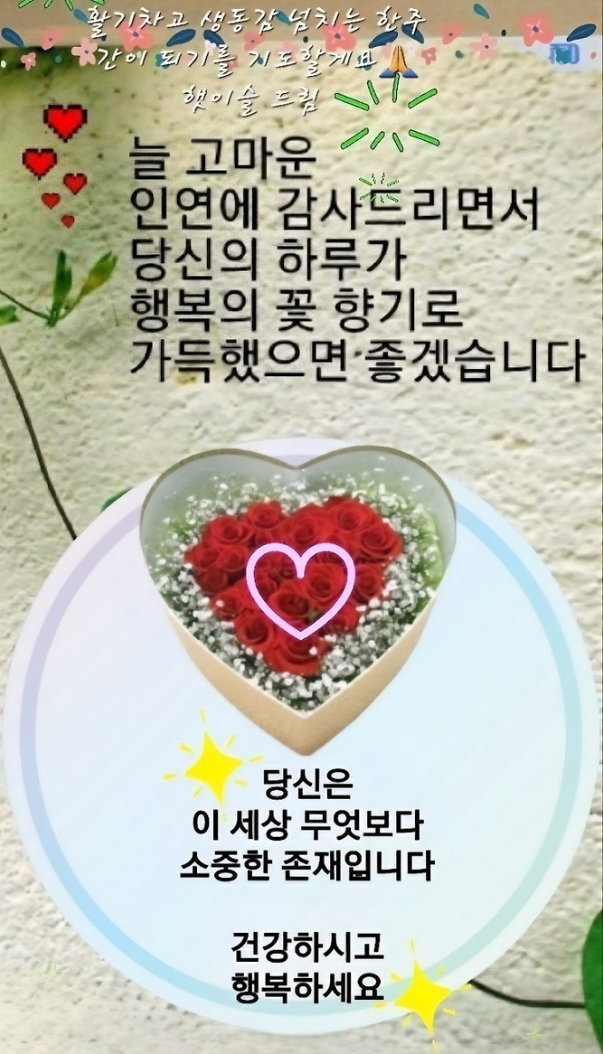카톡 인사 보낼실 때 골라서 사용하세요 작성자좋은 추억(인천)|작성시간26.03.22|조회수159 목록 댓글 8 글자크기 작게가 글자크기 크게가 카톡인사 골라서 사용하세요 다음검색 현재 게시글 추가 기능 열기 북마크 공유하기 신고 센터로 신고 댓글 댓글 8 댓글쓰기 답글쓰기 댓글 리스트 작성자여행가 | 작성시간 26.03.22 감사합니다 작성자초원에서 | 작성시간 26.03.22 예쁜 이미지 고맙습니다 수고하셨습니다 작성자향기로 말을 거는 꽃처럼(대구) | 작성시간 26.03.22 늘 감사합니다 ~^^♡ 이미지 확대 작성자산타리(파주) | 작성시간 26.03.22 감사합니다 작성자잉꼬 (서울) | 작성시간 26.03.22 감사합니다. 댓글 전체보기