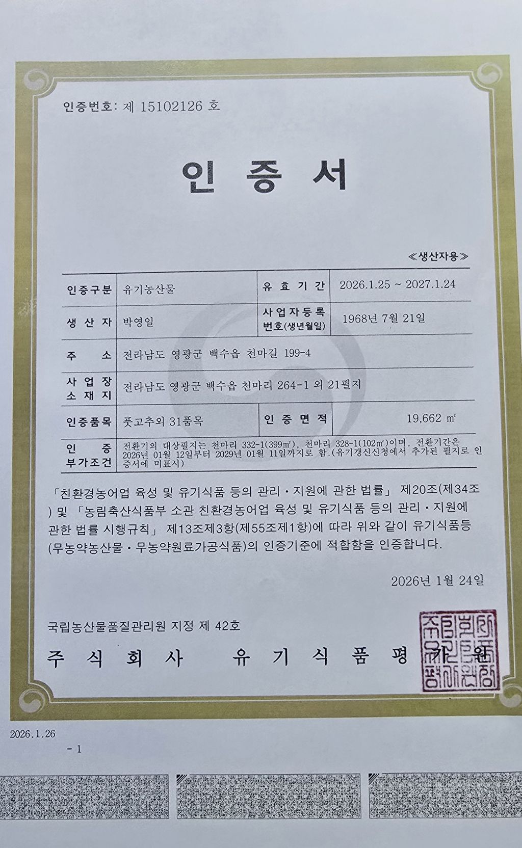 | 친환경인증확인/ HACCP구분 | 유기농인증 제15102126호 |