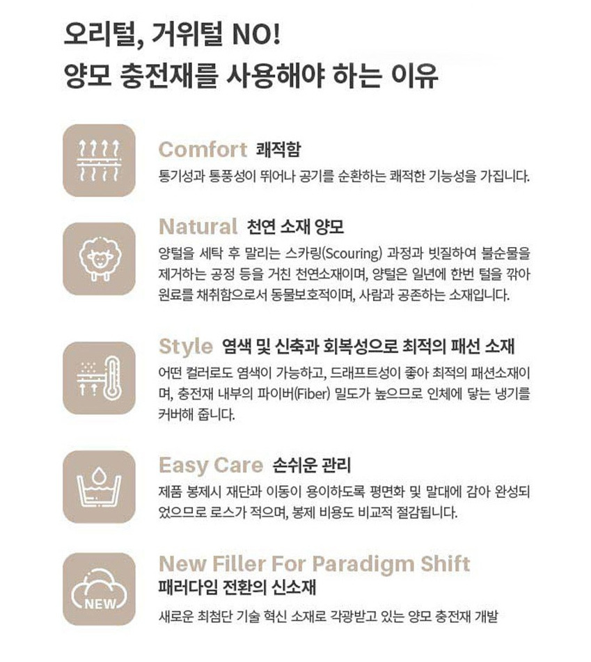 "오리털 다운 과는 다른 천연양모로 가벼우면 보온 기능이 탁월하며 털 빠짐이 없으며