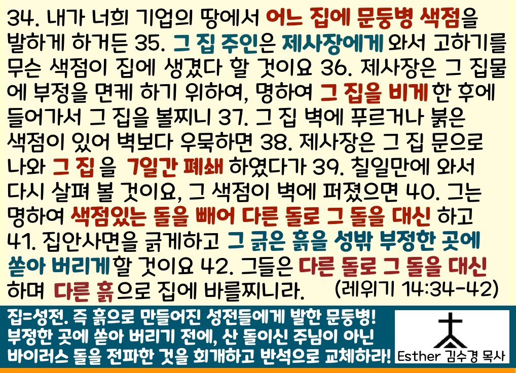 필자가 말하고자 하는 것은, 지금 벌어지고 있는 코로나바이러스에 대한 것이다. 전염병은 늘 하나님의 심판의 도구이다. 주께서 교회를 핍박하는 중국과 이란 및 WCC를 비롯하여 카톨릭과 바람난 교회를 심판하시기 위하여 신종 코로나바이러스를 보내셨다.
