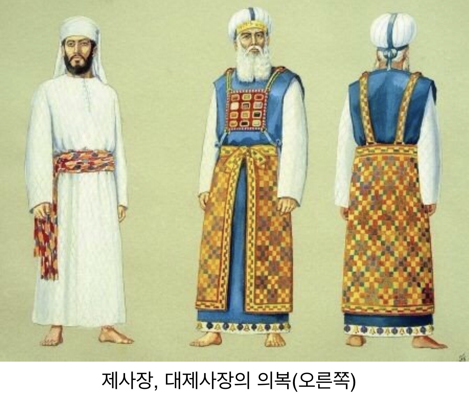 출애굽기 28장에는 제사장의 의복에 대하여 하나님께서 원하시는 방식이 기록되어 있다. 제사장은 먼저 베로 만든 속바지를 허리에서부터 넓적다리까지 내려오도록 입어서 하체가 드러나지 않도록 입어야 한다(42절). 그리고 그 위에 흰 베실로 짠 반포 속옷을 입어야 한다. 여기에서 속옷이라는 것은 양복을 입었을 때, 와이셔츠가 겉옷이 아니라 속에 입는 옷인 것과 같은 개념이다. 이 흰색 속옷은 제사장들의 평상복이다.