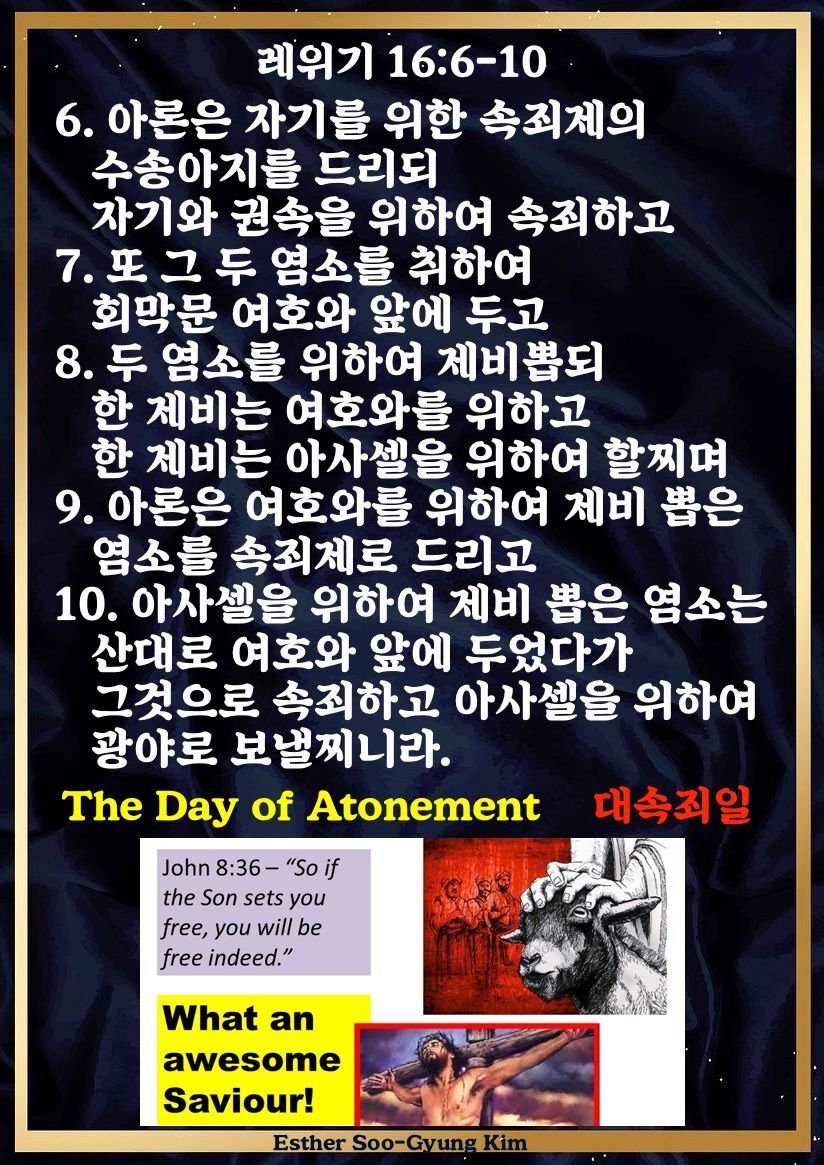 따라서 '대속죄일'이라는 말은 우리의 죄와 허물을 씻어주고 덮어주고 용서해주시는 하나님의 긍휼하심으로 인하여 단절되었던 하나님과의 관계가 회복되어 하나님 아버지와 화해하여 은혜의 자리에 나아가게 되는 매우 기쁜 날이다.