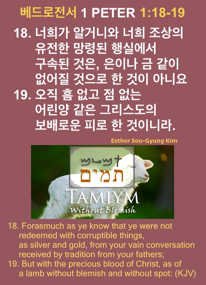 19. 오직 흠 없고 점 없는 어린양 같은 그리스도의 보배로운 피로 한 것이니라