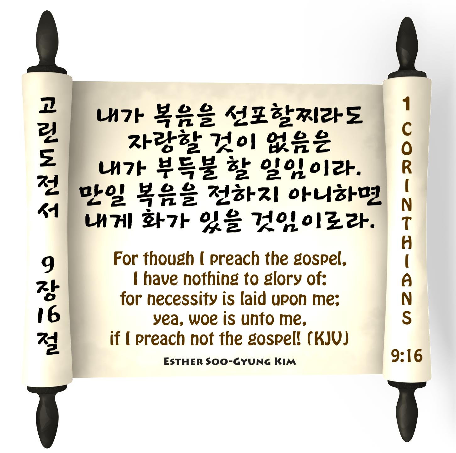 내가 복음을 전할찌라도 자랑할 것이 없음은 내가 부득불 할 일임이라. 만일 복음을 전하지 아니하면 내게 화가 있을 것임이로라