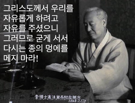 이승만은 그곳에서 칼을 차고 그 칼 위에 성경책을 올려놓고, 옆에 있는 사람이 그 성경책을 넘겨주는 도움을 받아가며 성경을 읽었던 것이다. 그 칼이 풀리는 것은 하루에 딱 한 번 뿐이었으니 그것은 사는 것이 아니었다. 그럼에도 불구하고 그는 그러한 상황에서 성경을 읽으며 빛을 보게 된 것이다.