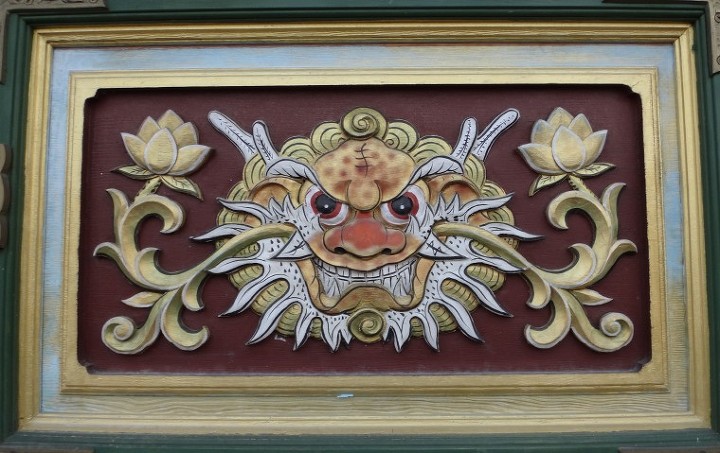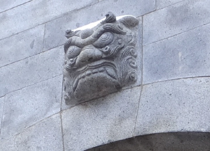 문 위에 있는 귀면은 아래를 내려다보고 있다 (삼운사 대불보전)
