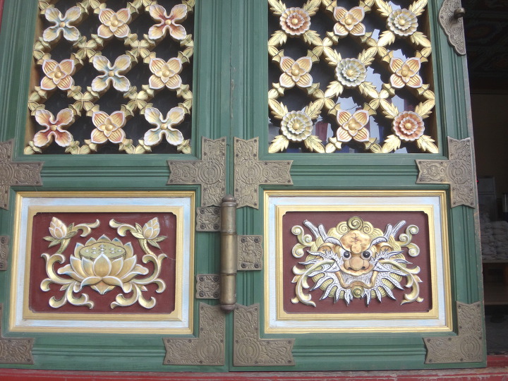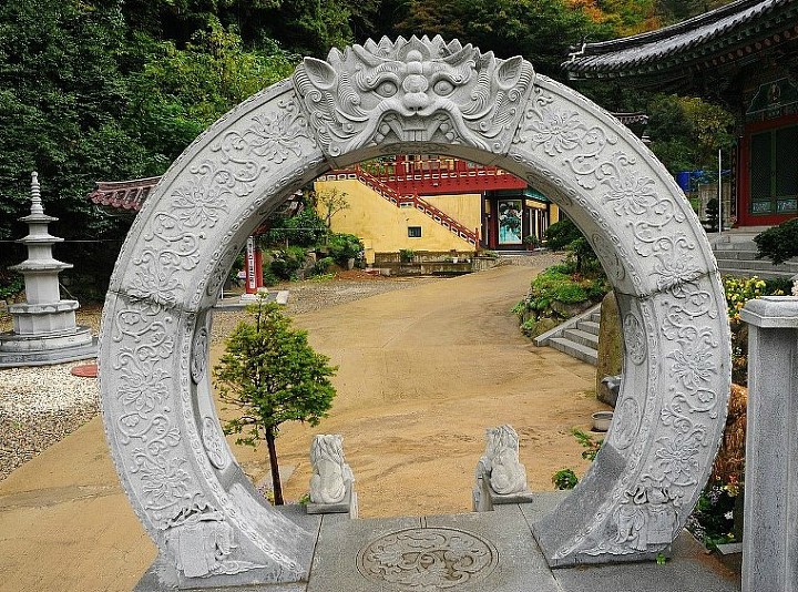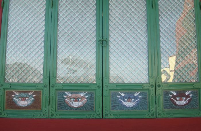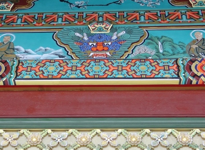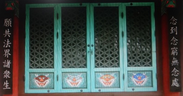 문 위에 있는 귀면은 아래를 내려다보고 있다 (구인사 역대조사전/ 용수보살, 지자대사, 대각국사)