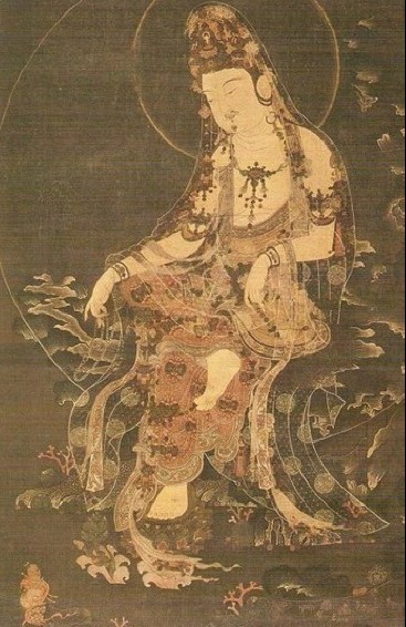 [참고] 관음보살은 기원적으로 볼 때 여성이었음은 의심할 여지가 없다. 이와모또(岩本裕)에 의하면 이란의 수신(水神)인 동시에 풍요의 여신인 아나히타가 당시 간다라 지방에서 여신으로 정착되어 있었으므로 관음보살은 이 여신이 불교화된 것으로 추정한다. 타키브스탄에서 출토된 아나히타상은 물병을 들고 있는데, 왼손에 지니고 있는 항아리에서는 물이 흘러 내리고 있다. 여기서 흥미 있는 사실은 손에 물바가지를 든 관음상과 여신상과의 관계이다. 한편으로는 돈황에서 출토된 수월관음이나 양류관음 등의 오른손에 들린 버들가지도 역시 아나히타 여신과 관계가 있는 것으로 믿어진다는 점이다. <한국민족문화대백과>