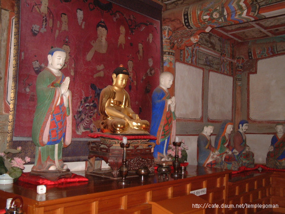 하동 쌍계사 나한전 - 석가모니불을 중심으로 좌우로 가섭존자 아난존자, 그리고 16나한이 모셔져 있음