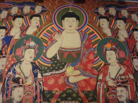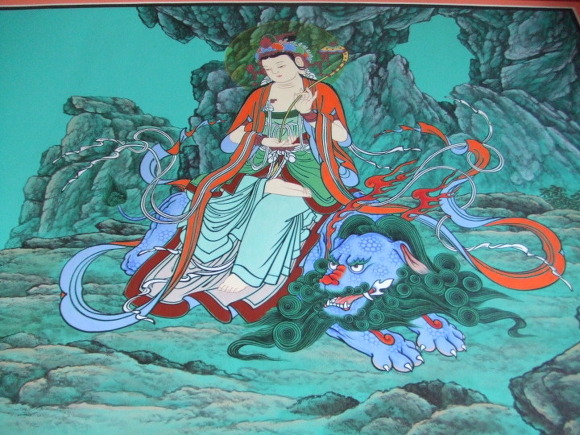 지혜를 상징. 사자를 타고있음. 석가모니불 왼쪽에서 보좌