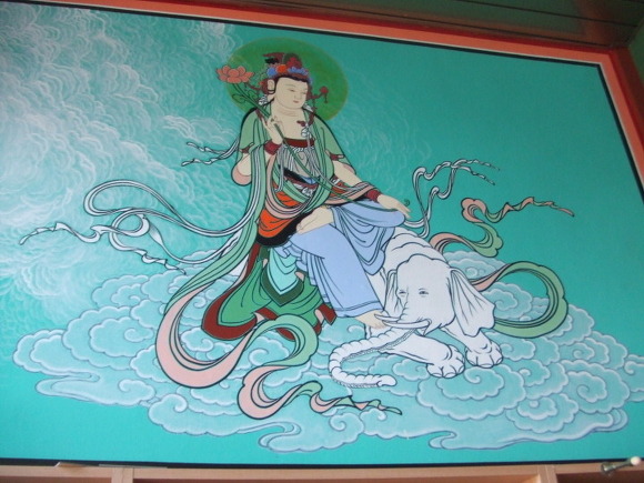 보살행의 실천을 상징. 상아가 여섯개 달린 코끼리를 타고 있음. 석가모니불 오른쪽에서 보좌