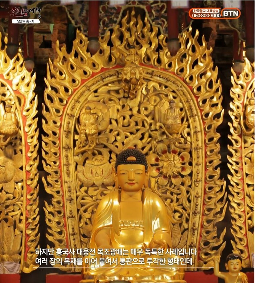 흥국대 대웅보전 목조광배는 매우 독특한 사례입니다. 여러 장의 목재를 이어 붙여서 통판으로 투각한 형태인데