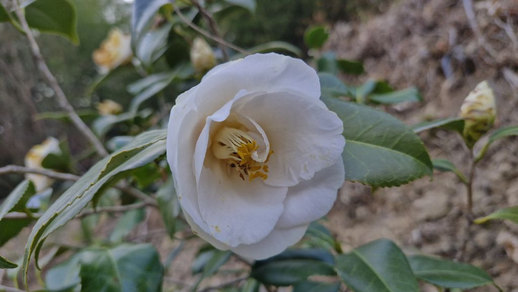 흰색의 동백이 두 그루 있습니다. 홑꽃으로 피는 것과 겹으로 피는 것입니다.
