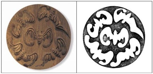 우리 문화에 박쥐 문양(↓) - 경대, 장, 농 손잡이, 베갯모, 한복 깃, 노리개 등에 박쥐가 날개를 펴고 날아가는 문양