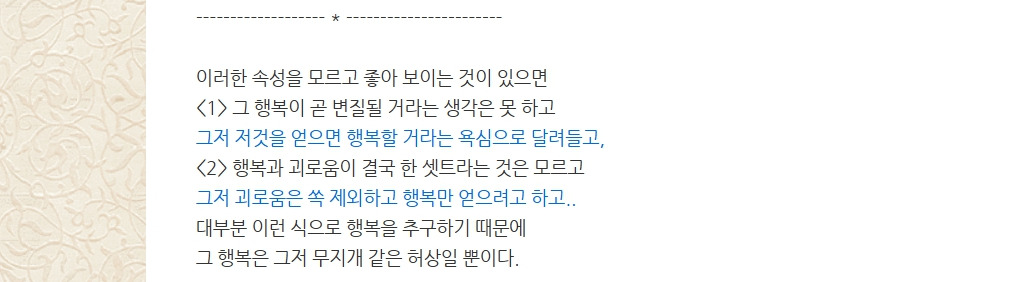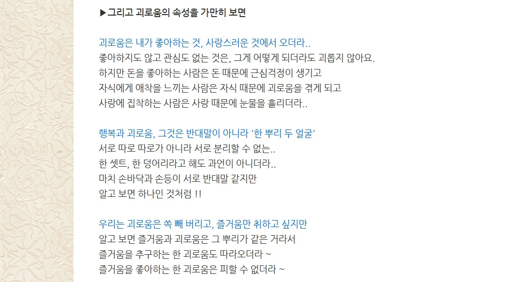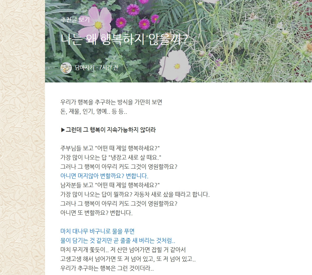나는 왜 행복하지 않을까? 작성자햇빛엽서|작성시간26.01.16|조회수20 목록 댓글 0 글자크기 작게가 글자크기 크게가 * 그림을 클릭하면 더 많이 볼 수 있습니다 / 언제나 햇빛엽서 * 다음검색 현재 게시글 추가 기능 열기 북마크 공유하기 신고 센터로 신고 댓글 댓글 0 댓글쓰기 댓글 리스트
