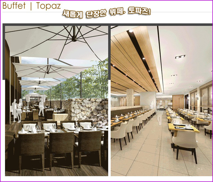 또한 뷔페레스토랑 토파즈도 새롭게 탈바꿈했다. 토파즈는 기존 600㎡ 규모에서 800㎡ 가량으로 크게 확대하고 요리 과정을 전면 개방한 ‘오픈 키친’에 유럽풍의 테라스를 설치해 품격을 높였다.