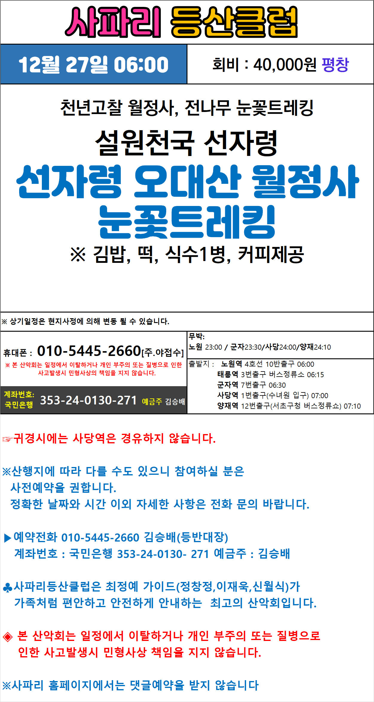 12월 27일 06:00 선자령 오대산 월정사 눈꽃트레킹 작성자그루터기|작성시간25.12.05|조회수181 목록 댓글 0 글자크기 작게가 글자크기 크게가 다음검색 현재 게시글 추가 기능 열기 북마크 신고 센터로 신고 댓글 댓글 0 댓글쓰기 답글쓰기 댓글 리스트
