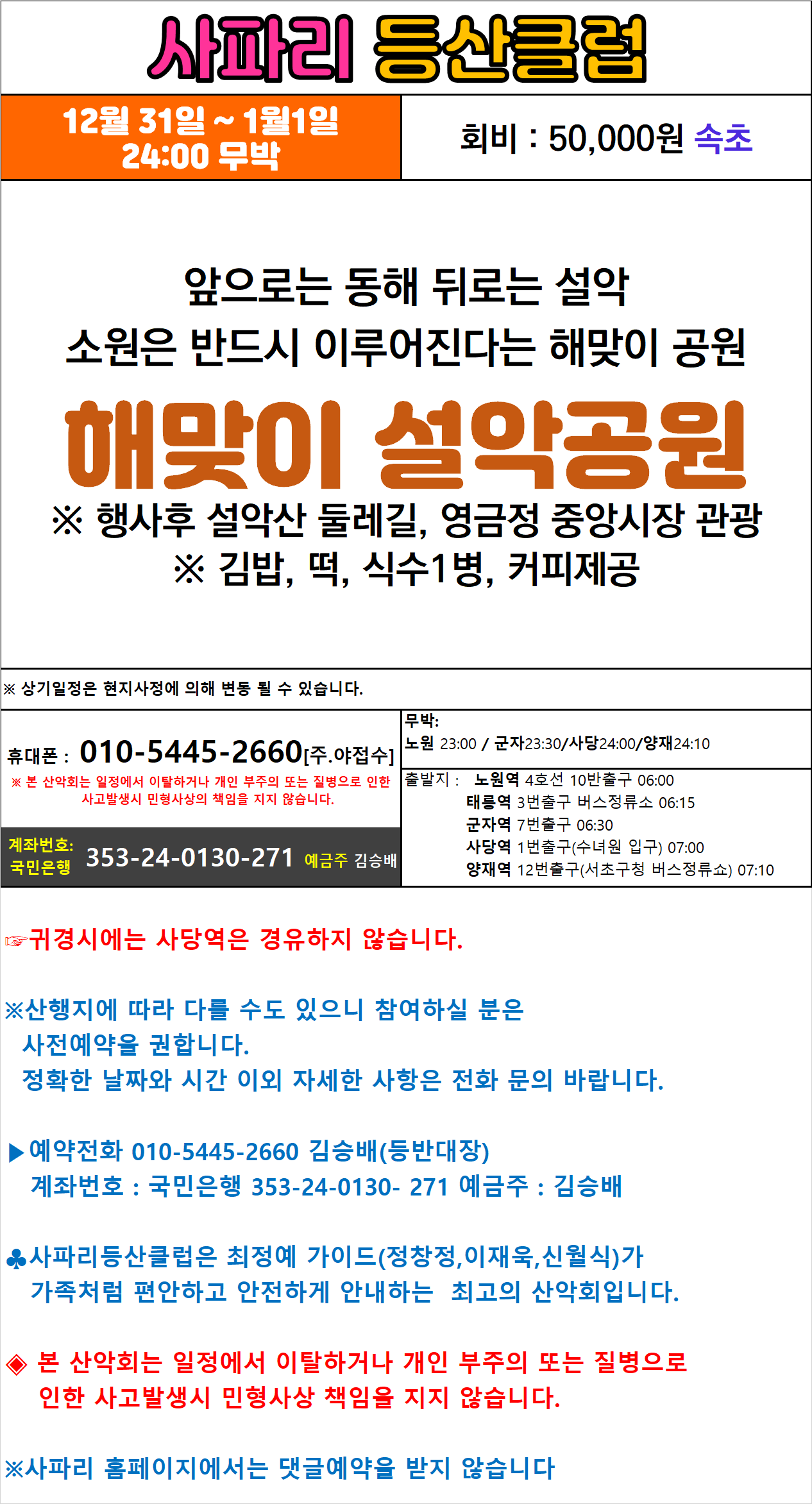 12월 31일 ~ 1월 1일 24:00 무박 해맞이 설악공원 작성자그루터기|작성시간25.12.05|조회수312 목록 댓글 0 글자크기 작게가 글자크기 크게가 다음검색 현재 게시글 추가 기능 열기 북마크 신고 센터로 신고 댓글 댓글 0 댓글쓰기 답글쓰기 댓글 리스트