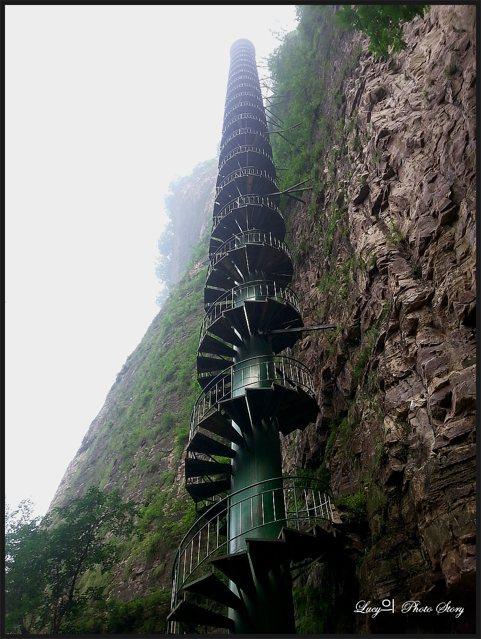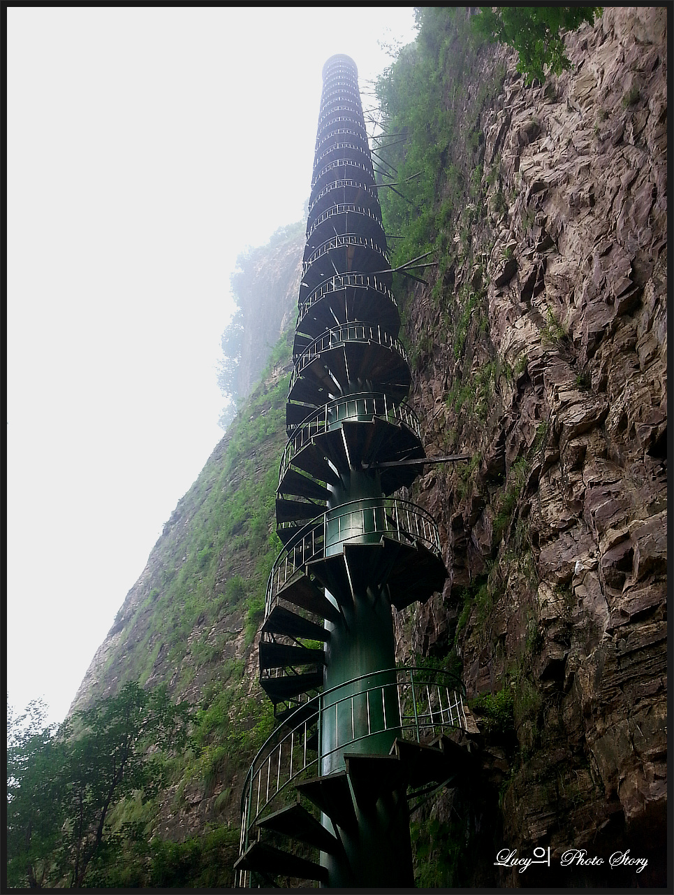 수직의 절벽에 수직으로 세워진 나선형 계단은