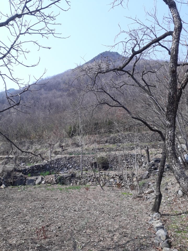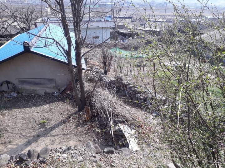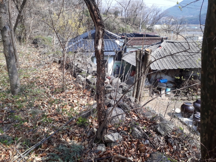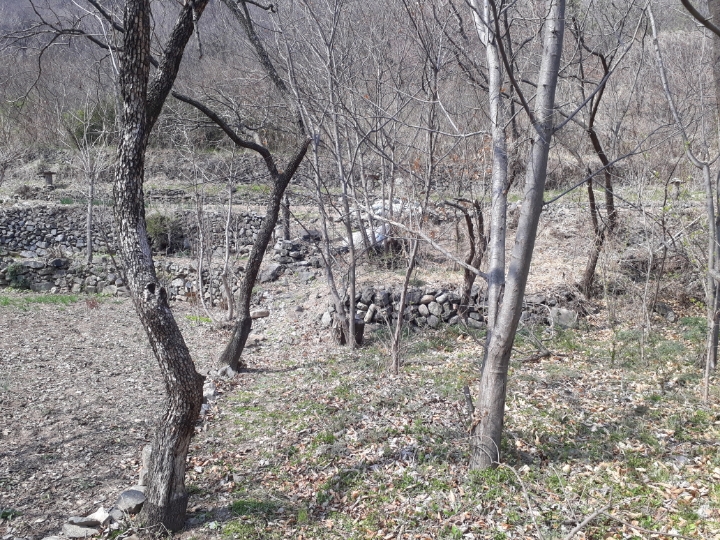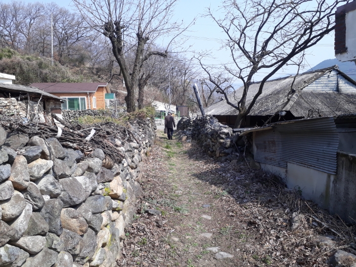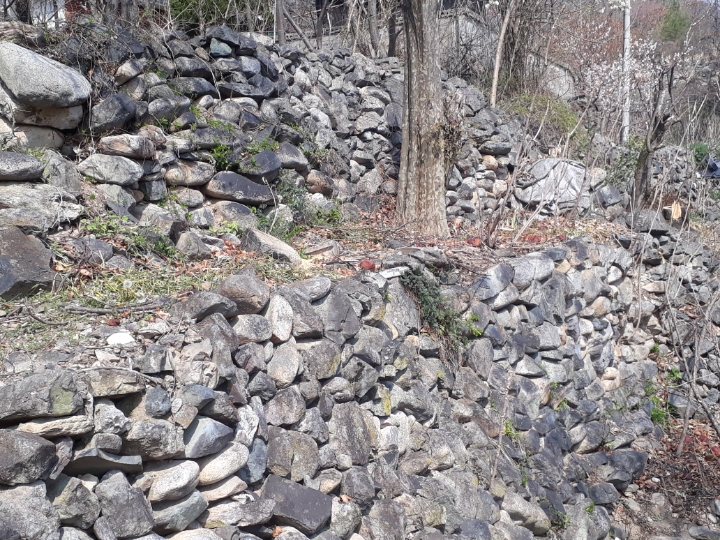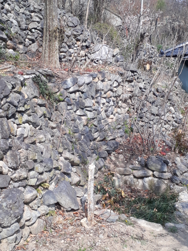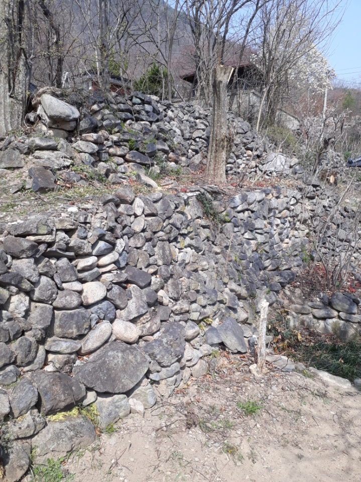 마을 뒷쪽에는 산돌로 축대를 쌓은 집터가 열대여섯집이 있었는데 다 철거되고 축대로 구분된 집터가 밭으로 변해 있었다