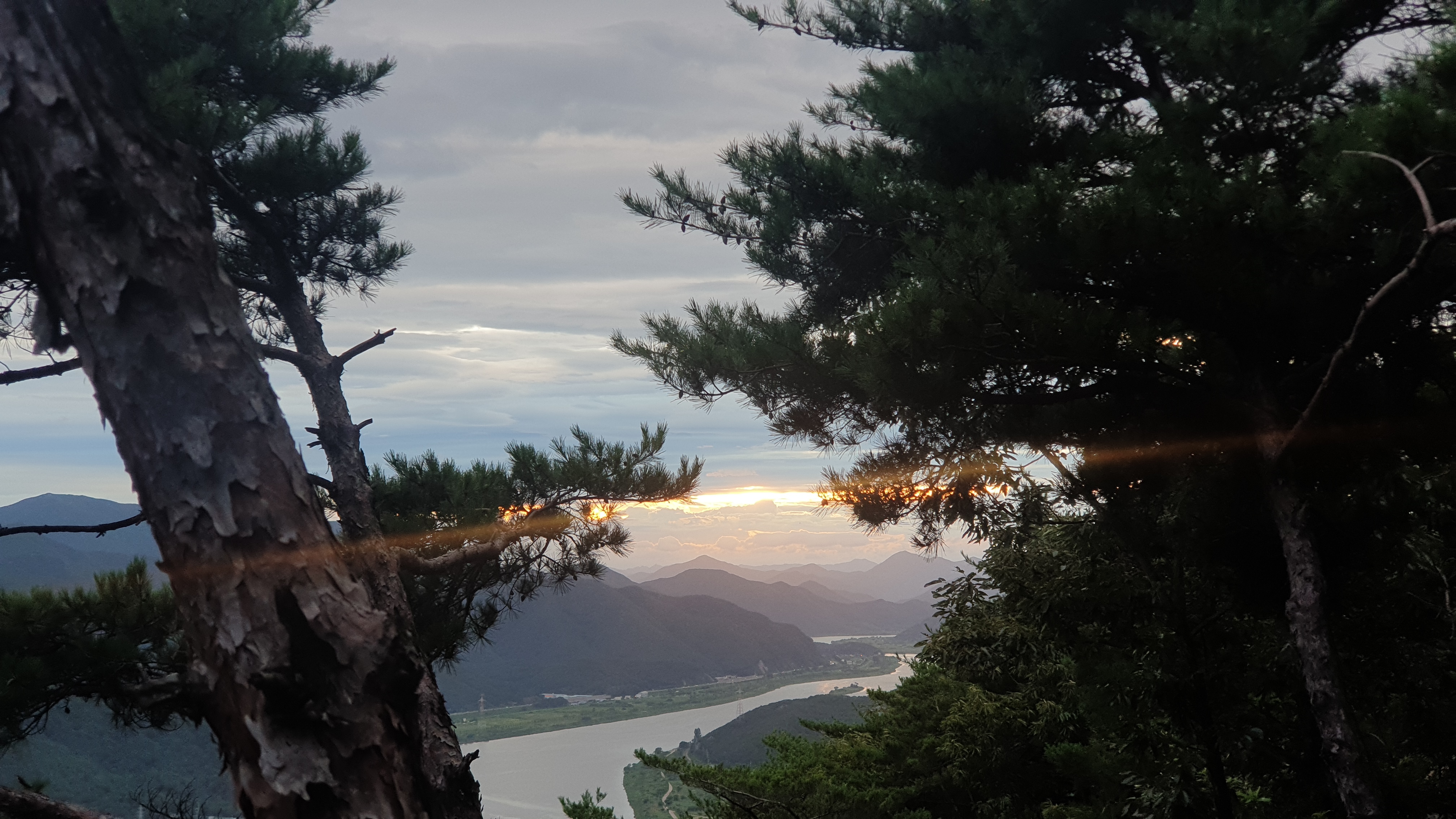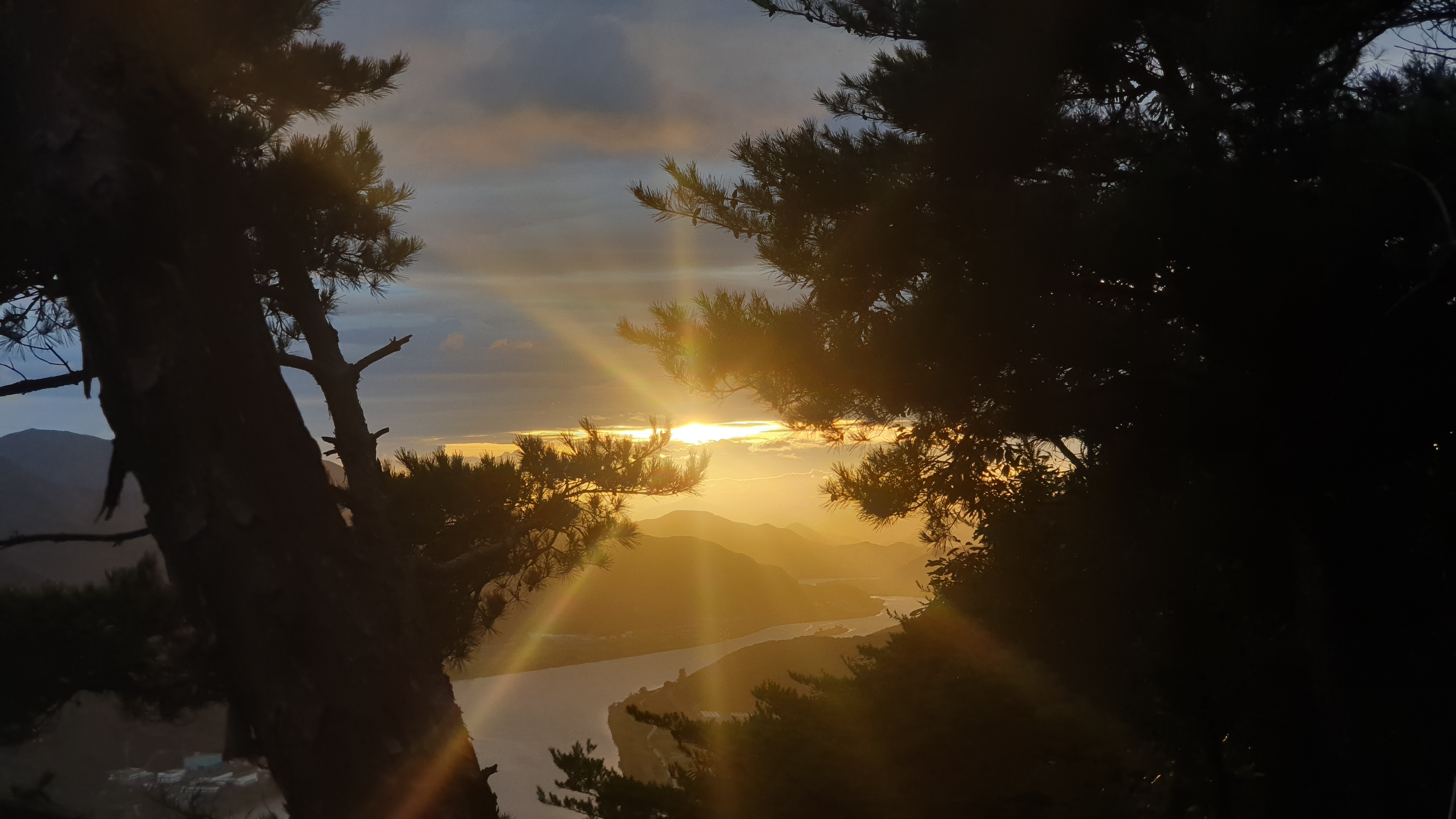 ▲해가 아래 위 구름 사이에서 넘어가고 있다.