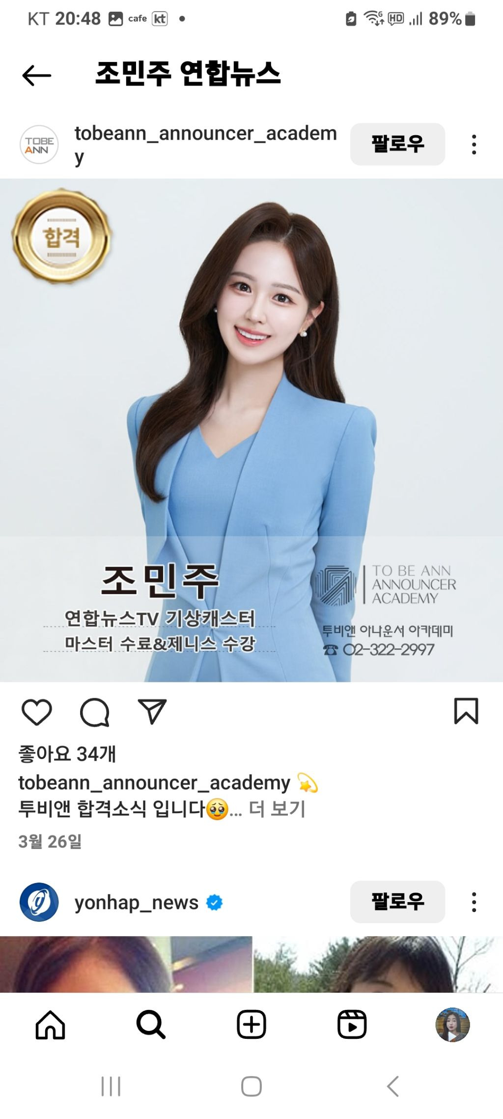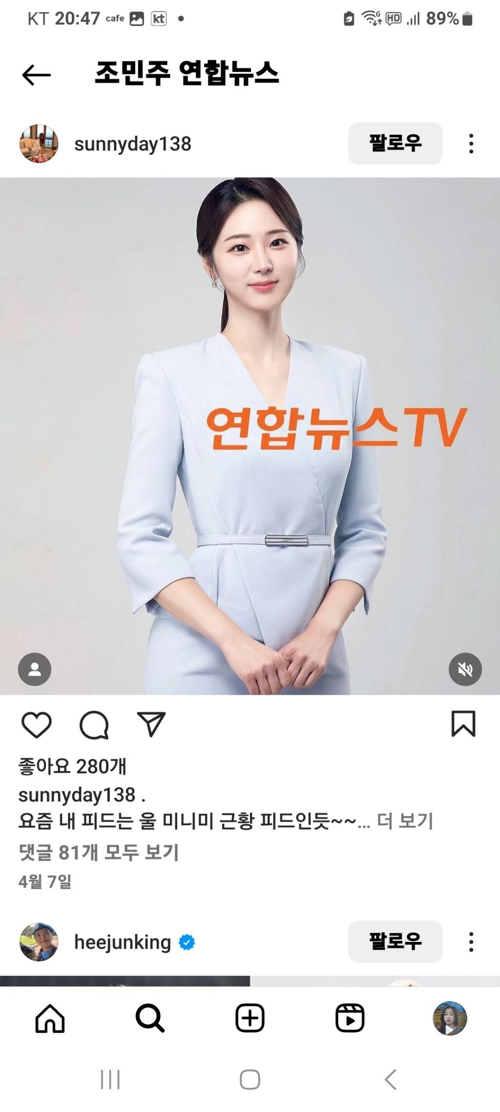그리고 현재 연합뉴스에서 활동한 조민주 기상캐스터의 사진을 캡쳐했습니다.