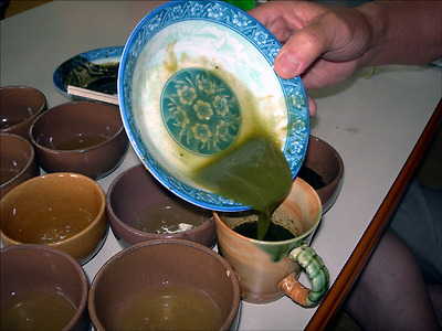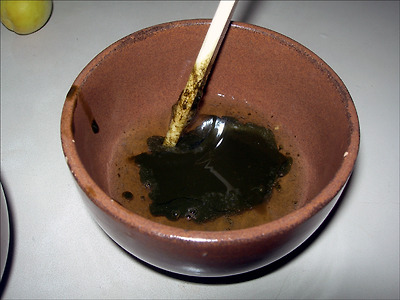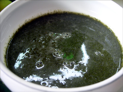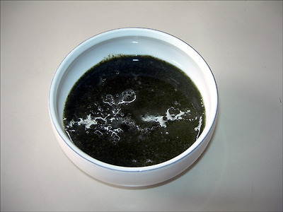 2. 머위잎(시골에서 담장밑에 심었다가 쌈도 싸먹기도함)을 즙을 내어 커피스푼 5스푼을 흰자위를 넣은 컵에 부어 젖는다.
