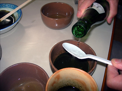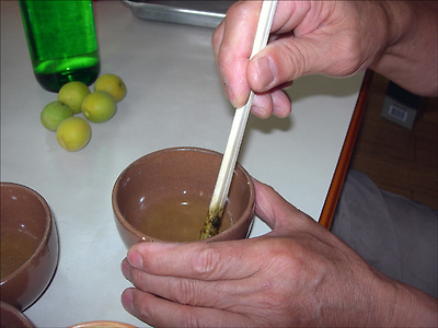 3. 법주 또는 청주(정종) 5스푼을 컵에 넣어 다시 젖는다(소주는 안됨) 매실 1개를 씨는 빼고 마늘 다지듯이 다져서 컵에 넣어 젖는다.
