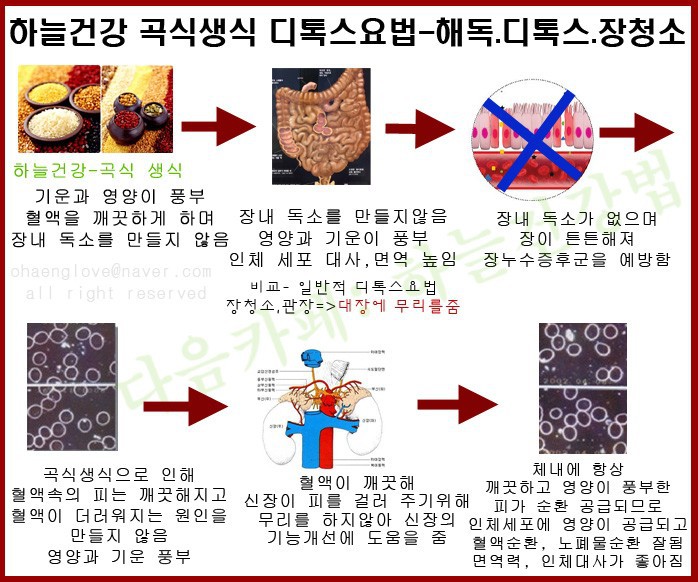 * 기타 청소법ㅡ최상의 청소법은 단식 혹은 금식이다. 이사야58:8에 "그리하면 네 빛이 아침같이 비췰 것이며 네 치료가 급속할 것이며" 기록되어 있다. 간식만 하지 않아도 백 세는 잔병 없이 산다. 저녁만 금식해도 훌륭하다. 스페인의 격언에 “100명의 의사를 찾기 전에 저녁을 굶어라”는 말이 있다. 저녁 만찬이 깊은 수면을 방해하고 피를 가장 탁하게 한다. 아침이 배출의 시간이라지만 아침도 먹어야 변의를 느끼고 배출이 되는 것이다. 저녁단식도 힘들다면 밥 고기 등을 제외하고 콩나물국 미역국 등의 국과 찬 위주의 식사만해도 배고프지 않고 날아갈 듯 가벼운 것을 느낄 수 있을 것이다. 밥과 물을 따로 먹는 음양식도 변에 냄새가 나지 않을 만큼 인체정화에 좋다. 곡류 중심의 채식을 고체 위주로 식사하고 간식을 피하고 2시간 후에 물을 마신다. 종합적으로 충분한 영양과 소식과 운동과 바른자세와 충분한 수면과 감사하는 신앙생활이 중요함을 알 수 있다