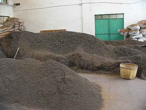 유념한 찻잎을 대나무 광주리에 얇고 넓게 깔아 햇볕에 말리는 과정을 거친 후의 반제품 상태의 차.