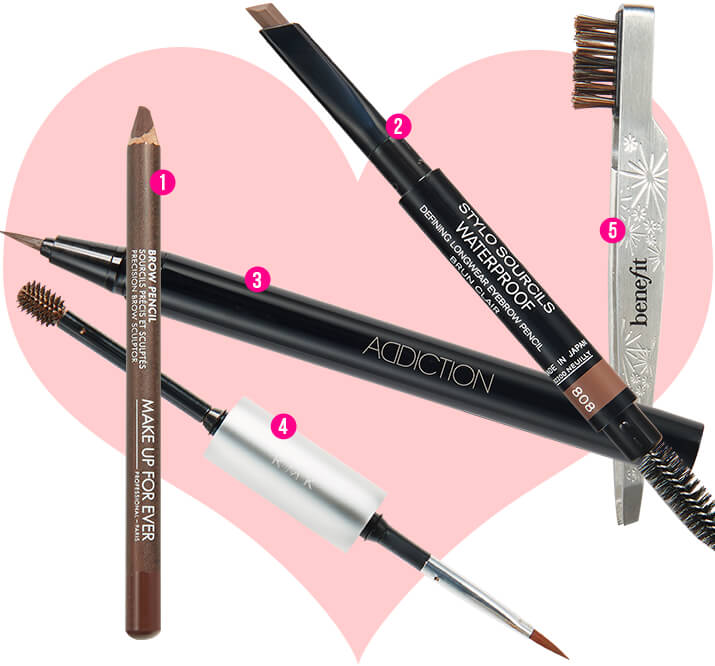 1 메이크업 포에버 브로우 펜슬 . 2 샤넬 스틸로 쑤르씰 워터프루프 808 브륀 끌레흐 3 어딕션 리퀴드 아이브로우 4 RMK W 아이브로우 컬러즈 5 베네피트 그루밍 트위저&브러쉬
