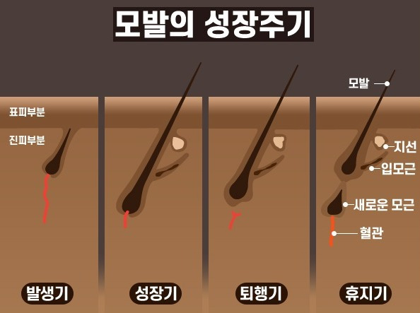 그리고 장기적으로는 모발의 휴지기를 짧게 만듭니다. 머리카락은 약 4~7년의 주기로 길었다가 빠지고를 반복하는데, 이 기간이 짧아져서 머리카락이 빨리 빠지고, 나중에는 모발이 다시 자라지 않는 탈모를 유발하기도 합니다.
