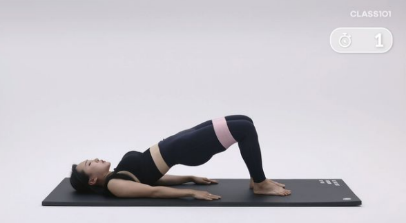 1. 밴드를 이용해 주시면 더 자극을 깊게 느끼실 수 있어요. 밴드가 없다면 그냥 진행하셔도 무방합니다. 밴드를 무릎 반 뼘, 한 뼘 정도 떨어진 위치에 걸어주세요.