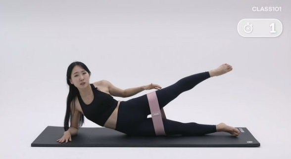 2. 어깨와 귀를 최대한 멀리한 상태에서, 엉덩이 힘으로 밴드를 들어 올려주세요. 고관절과 허벅지 바깥 부분에 힘이 들어오는지 체크해 주세요.