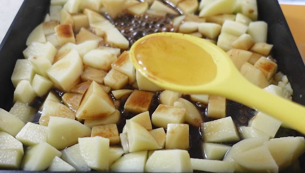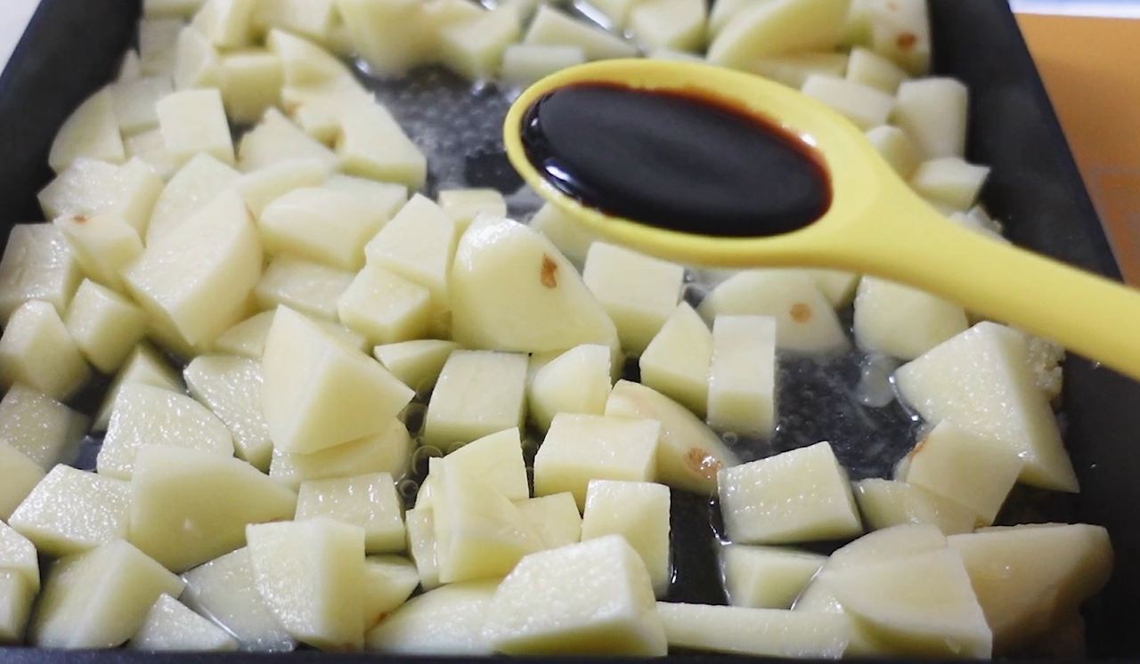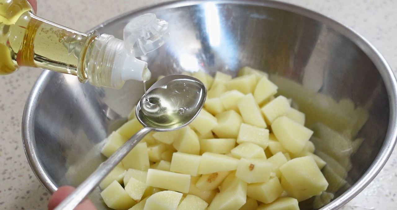 감자 3-4개 (500g), 액상스테비아 4큰술, 식용유 3큰술, 다진 마늘 0.5큰술,